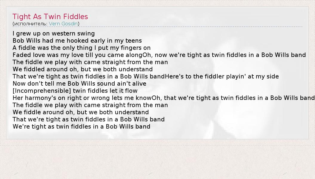 А как ты думаешь, о чем песня "Tight As Twin Fiddles" ?