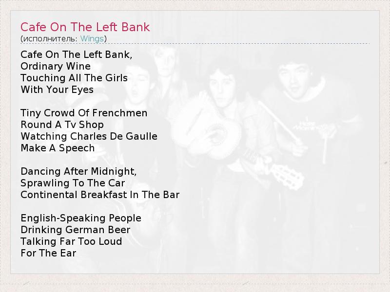 А как ты думаешь, о чем песня "Cafe On The Left Bank" ?