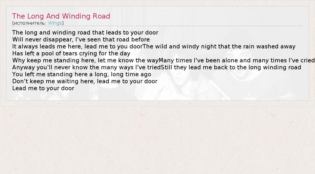 The long and winding road that leads to your door Will never disappear, I've seen that road before It always leads me here, lead me to you doorThe wild and windy night that the rain washed away Has left a pool of tears crying for the day Why keep me standing here, let me know the wayMany times I've been alone and many times I've cried Anyway you'll never know the many ways I've triedStill they lead me back to the long winding road You left me standing here a long, long time ago Don't keep me waiting here, lead me to your door Lead me to your door