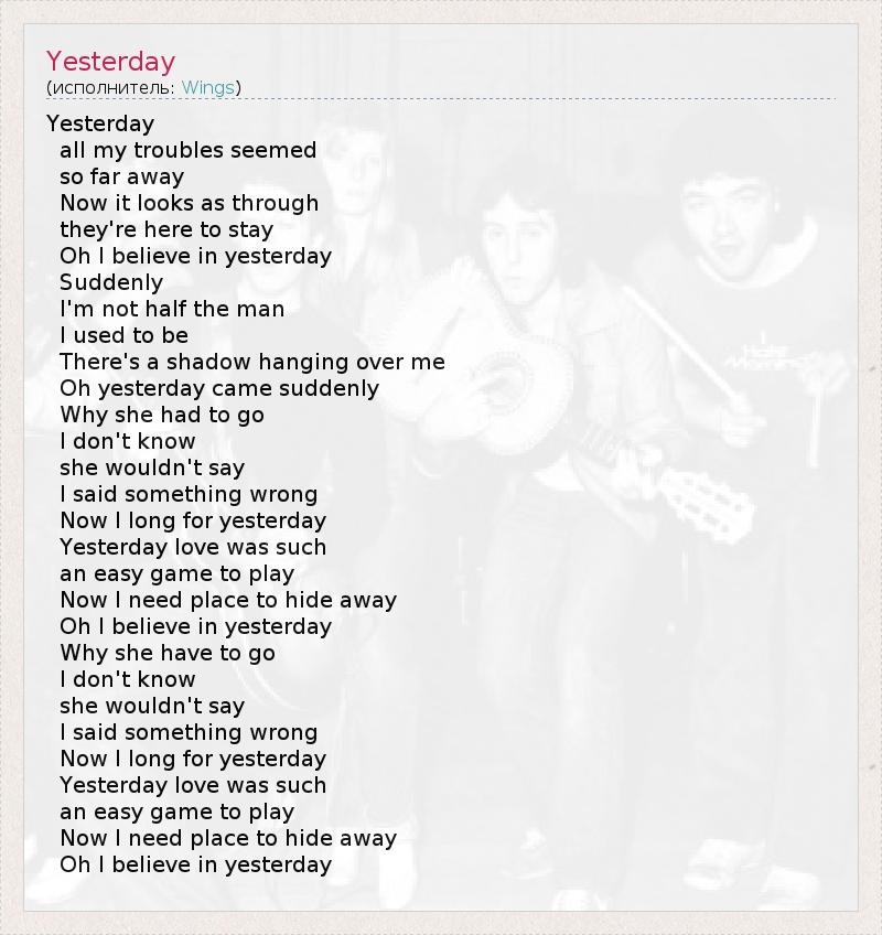 Yesterday all my troubles seemed so far away Now it looks as through they're here to stay Oh I believe in yesterday Suddenly I'm not half the man I used to be There's a shadow hanging over me Oh yesterday came suddenly Why she had to go I don't know she wouldn't say I said something wrong Now I long for yesterday Yesterday love was such an easy game to play Now I need place to hide away Oh I believe in yesterday Why she have to go I don't know she wouldn't say I said something wrong Now I long for yesterday Yesterday love was such an easy game to play Now I need place to hide away Oh I believe in yesterday