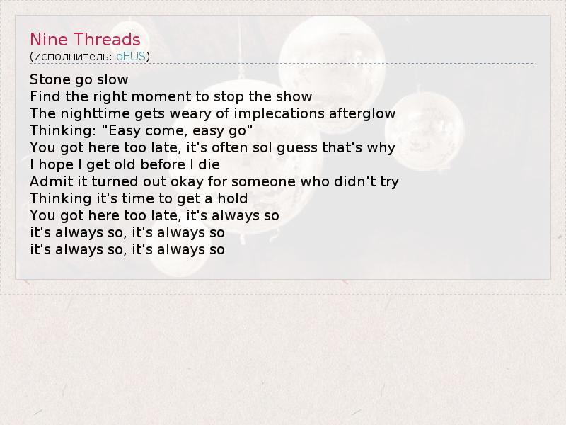 А как ты думаешь, о чем песня "Nine Threads" ?