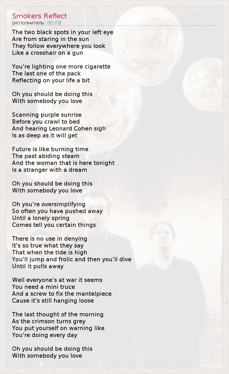 Два черных пятен в вашей левым глазом Есть от глядя на солнце Они следуют куда ни глянь Как перекрестие на пистолет Вы освещая больше одной сигареты В прошлом один из стаи Размышляя о своей жизнибитной О , вы должны делать это С кем-то вы любите Сканирование фиолетовый восход солнца Перед тем, как ползти к кровати И слух Леонард Коэн вздох Есть так же глубоко, как он будет получать Будущее , как время горения Мимо пребывает пара Иженщина, которая сегодня здесь Являетсянезнакомец с мечтой О , вы должны делать это С кем-то вы любите О, ты упрощаю Так часто вы оттолкнули До одинокой весной Поставляется рассказать вам некоторые вещи Там нет смысла отрицать Это настолько верно , что они говорят Это когдаприлив высокий Вы прыгать и резвиться , а затем вы будете погружаться До тех пор, пока отстраняется Ну все это в состоянии войны кажется Вам нужен мини- перемирие Ивинт , чтобы зафиксировать каминную полку Потому что это все еще болтается Последняя мысль утром Какмалиновый седеют Вы поставьте себя на предупреждение , как Вы делаете каждый день О , вы должны делать это С кем-то вы любите