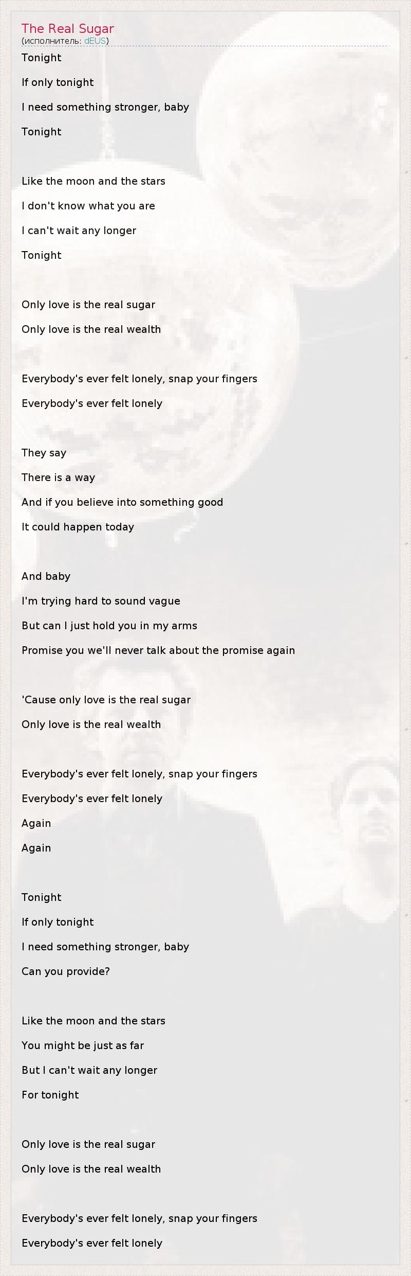 Tonight If only tonight I need something stronger, baby Tonight Like the moon and the stars I don't know what you are I can't wait any longer Tonight Only love is the real sugar Only love is the real wealth Everybody's ever felt lonely, snap your fingers Everybody's ever felt lonely They say There is a way And if you believe into something good It could happen today And baby I'm trying hard to sound vague But can I just hold you in my arms Promise you we'll never talk about the promise again 'Cause only love is the real sugar Only love is the real wealth Everybody's ever felt lonely, snap your fingers Everybody's ever felt lonely Again Again Tonight If only tonight I need something stronger, baby Can you provide? Like the moon and the stars You might be just as far But I can't wait any longer For tonight Only love is the real sugar Only love is the real wealth Everybody's ever felt lonely, snap your fingers Everybody's ever felt lonely