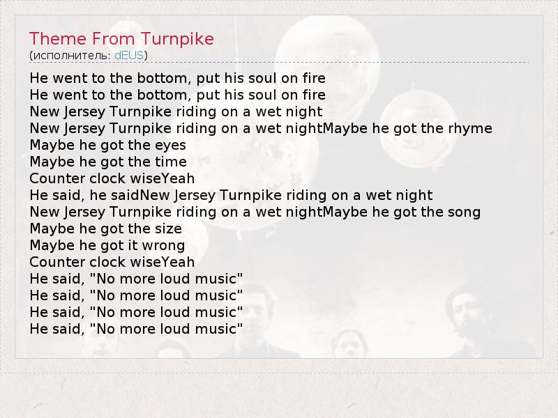 А как ты думаешь, о чем песня "Theme From Turnpike" ?