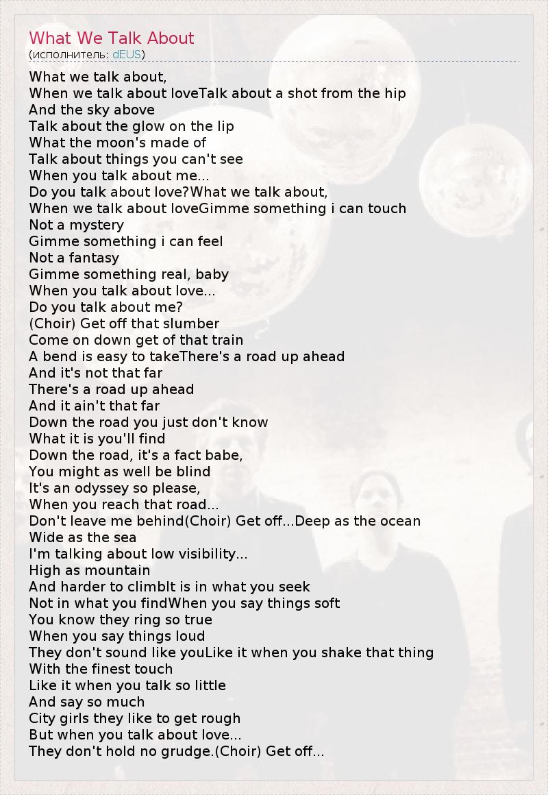 What we talk about, When we talk about loveTalk about a shot from the hip And the sky above Talk about the glow on the lip What the moon's made of Talk about things you can't see When you talk about me... Do you talk about love?What we talk about, When we talk about loveGimme something i can touch Not a mystery Gimme something i can feel Not a fantasy Gimme something real, baby When you talk about love... Do you talk about me? (Choir) Get off that slumber Come on down get of that train A bend is easy to takeThere's a road up ahead And it's not that far There's a road up ahead And it ain't that far Down the road you just don't know What it is you'll find Down the road, it's a fact babe, You might as well be blind It's an odyssey so please, When you reach that road... Don't leave me behind(Choir) Get off...Deep as the ocean Wide as the sea I'm talking about low visibility... High as mountain And harder to climbIt is in what you seek Not in what you findWhen you say things soft You know they ring so true When you say things loud They don't sound like youLike it when you shake that thing With the finest touch Like it when you talk so little And say so much City girls they like to get rough But when you talk about love... They don't hold no grudge.(Choir) Get off...