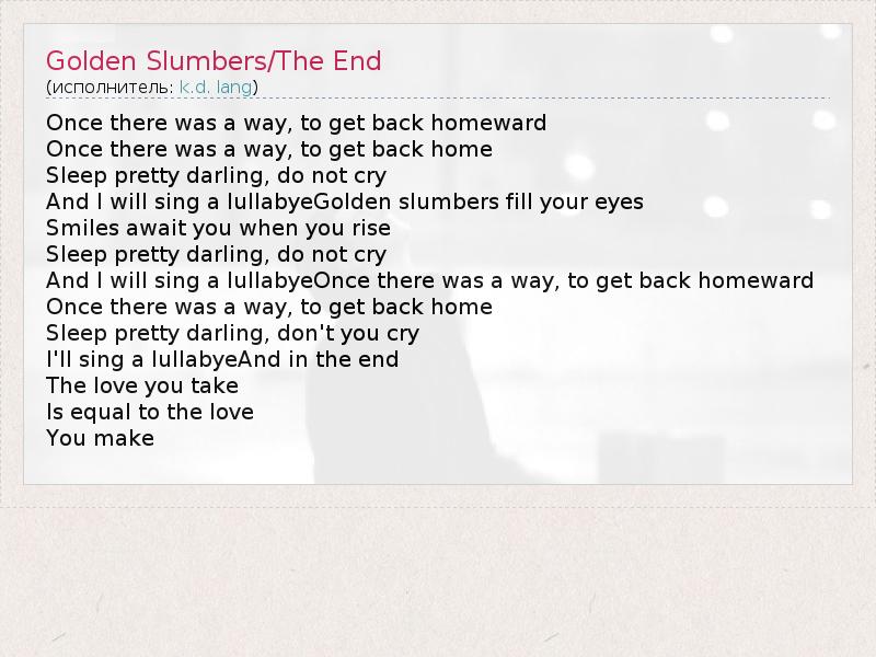 Once there was a way, to get back homeward Once there was a way, to get back home Sleep pretty darling, do not cry And I will sing a lullabyeGolden slumbers fill your eyes Smiles await you when you rise Sleep pretty darling, do not cry And I will sing a lullabyeOnce there was a way, to get back homeward Once there was a way, to get back home Sleep pretty darling, don't you cry I'll sing a lullabyeAnd in the end The love you take Is equal to the love You make