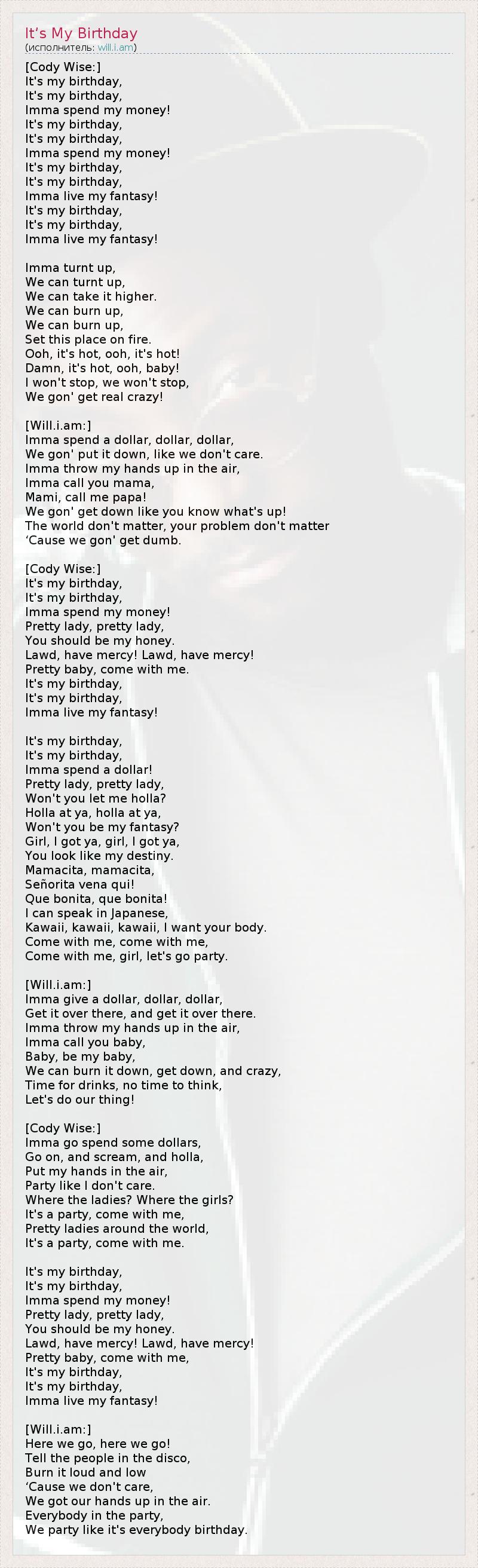 [Cody Wise:] Это мой день рождения, Это мой день рождения, Я буду тратить свои деньги! Это мой день рождения, Это мой день рождения, Я буду тратить свои деньги! Это мой день рождения, Это мой день рождения, Я воплощу свои фантазии в жизнь! Это мой день рождения, Это мой день рождения, Я воплощу свои фантазии в жизнь, Я заведусь, Мы можем завестись, Мы можем поднять градус. Мы можем зажечь, Мы можем зажечь, Устроить тут пожар. О-о, здесь жарко, о-о, здесь жарко, Чёрт побери, здесь жарко, о-о, детка! Я не прекращу, мы не прекратим, Мы будем безумствовать по полной! [Will.i.am:] Я потрачу доллар, доллар, доллар, Мы будем делать это, будто нам наплевать. Я вскину руки в воздух, Я буду звать тебя мамочкой, Мамочка, называй меня папулей! Мы будем отрываться, ты же знаешь почему! Окружающий мир не важен, твои проблемы не важны, Потому что мы собираемся отключиться. [Cody Wise:] Это мой день рождения, Это мой день рождения, Я буду тратить свои деньги! Прекрасная дама, прекрасная дама, Ты должна стать моей милашкой. Боже, смилуйся! Боже, смилуйся! Малютка, пойдём со мной. Это мой день рождения, Это мой день рождения, Я воплощу свои фантазии в жизнь! Это мой день рождения, Это мой день рождения, Я буду тратить доллары! Прекрасная дама, прекрасная дама, Не позволите ли мне приударить за вами? Приударить за вами, приударить за вами, Не станете ли вы моей фантазией? Детка, я тебя понимаю, детка, ты это понимаешь, Ты похожа на мою суженую. Мамасита, мамасита, Сеньорита, иди сюда! Какая красавица, какая красавица! Я умею говорить по-японски: Каваий, каваий, каваий, я хочу тебя. Пойдём со мной, пойдём со мной, Пойдём со мной, детка, давай затусим! [Will.i.am:] Я достану доллар, доллар, доллар, Давай их сюда, давай сюда. Я вскину руки в воздух, Я буду звать тебя деткой, Детка, будь моей деткой, Мы можем зажечь здесь, оторваться по-сумасшедшему, Время пить, нет времени думать, Займёмся делом! [Cody Wise:] Пойду, просажу долларов, Давай, кричи и вопи, Поднимаю руки в воздух, Веселюсь, будто мне плевать. Где дамы? Где девчонки? Это вечеринка, идёмте со мной, Красавицы со всего мира, Это вечеринка, идёмте со мной. Это мой день рождения, Это мой день рождения, Я буду тратить свои деньги! Прекрасная дама, прекрасная дама, Ты должна стать моей милашкой. Боже, смилуйся! Боже, смилуйся! Малютка, пойдём со мной, Это мой день рождения, Это мой день рождения, Я воплощу свои фантазии в жизнь! [Will.i.am:] Вот и мы, вот и мы! Скажите народу на дискотеке, Чтобы курили что посильнее и понезаметнее, Потому что нам всё равно, Наши руки подняты. Все на тусе, Мы веселимся так, будто у всех день рождения.