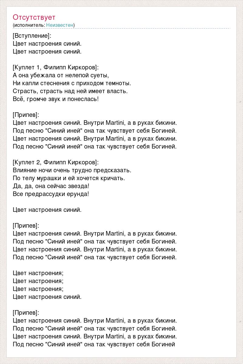 [Вступление]: Цвет настроения синий. Цвет настроения синий. [Куплет 1, Филипп Киркоров]: А она убежала от нелепой суеты, Ни капли стеснения с приходом темноты. Страсть, страсть над ней имеет власть. Всё, громче звук и понеслась! [Припев]: Цвет настроения синий. Внутри Martini, а в руках бикини. Под песню "Синий иней" она так чувствует себя Богиней. Цвет настроения синий. Внутри Martini, а в руках бикини. Под песню "Синий иней" она так чувствует себя Богиней. [Куплет 2, Филипп Киркоров]: Влияние ночи очень трудно предсказать. По телу мурашки и ей хочется кричать. Да, да, она сейчас звезда! Все предрассудки ерунда! Цвет настроения синий. [Припев]: Цвет настроения синий. Внутри Martini, а в руках бикини. Под песню "Синий иней" она так чувствует себя Богиней. Цвет настроения синий. Внутри Martini, а в руках бикини. Под песню "Синий иней" она так чувствует себя Богиней. Цвет настроения; Цвет настроения; Цвет настроения; Цвет настроения синий. [Припев]: Цвет настроения синий. Внутри Martini, а в руках бикини. Под песню "Синий иней" она так чувствует себя Богиней. Цвет настроения синий. Внутри Martini, а в руках бикини. Под песню "Синий иней" она так чувствует себя Богиней