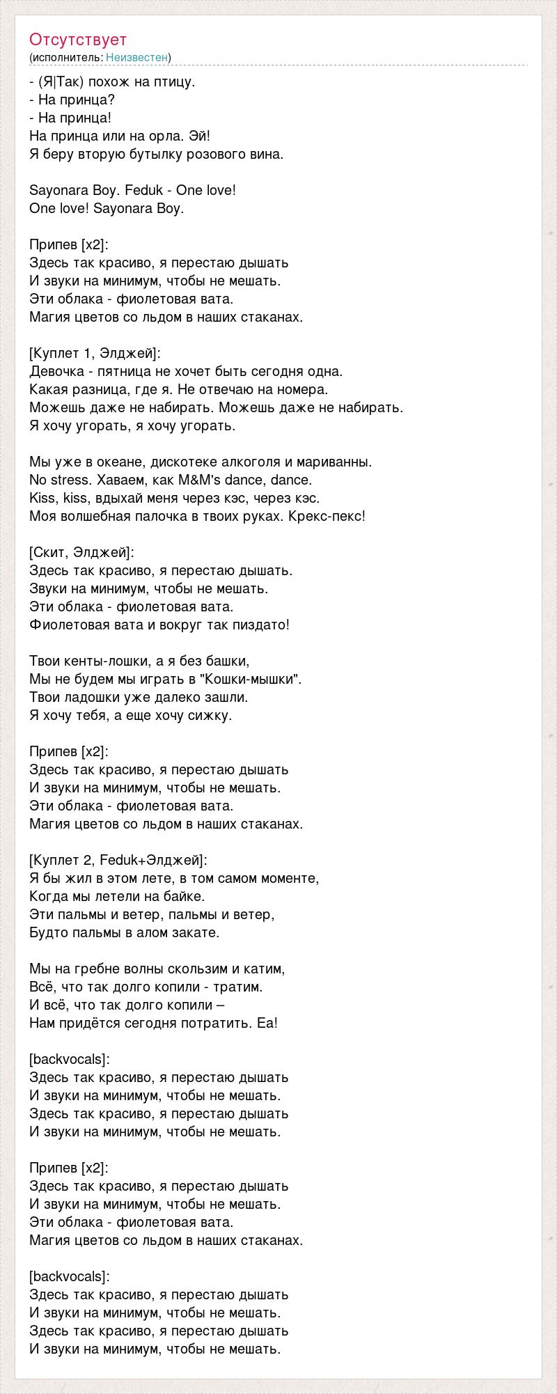 - (Я|Так) похож на птицу. - На принца? - На принца! На принца или на орла. Эй! Я беру вторую бутылку розового вина. Sayonara Boy. Feduk - One love! One love! Sayonara Boy. Припев [x2]: Здесь так красиво, я перестаю дышать И звуки на минимум, чтобы не мешать. Эти облака - фиолетовая вата. Магия цветов со льдом в наших стаканах. [Куплет 1, Элджей]: Девочка - пятница не хочет быть сегодня одна. Какая разница, где я. Не отвечаю на номера. Можешь даже не набирать. Можешь даже не набирать. Я хочу угорать, я хочу угорать. Мы уже в океане, дискотеке алкоголя и мариванны. No stress. Хаваем, как M&M's dance, dance. Kiss, kiss, вдыхай меня через кэс, через кэс. Моя волшебная палочка в твоих руках. Крекс-пекс! [Скит, Элджей]: Здесь так красиво, я перестаю дышать. Звуки на минимум, чтобы не мешать. Эти облака - фиолетовая вата. Фиолетовая вата и вокруг так пиздато! Твои кенты-лошки, а я без башки, Мы не будем мы играть в "Кошки-мышки". Твои ладошки уже далеко зашли. Я хочу тебя, а еще хочу сижку. Припев [x2]: Здесь так красиво, я перестаю дышать И звуки на минимум, чтобы не мешать. Эти облака - фиолетовая вата. Магия цветов со льдом в наших стаканах. [Куплет 2, Feduk+Элджей]: Я бы жил в этом лете, в том самом моменте, Когда мы летели на байке. Эти пальмы и ветер, пальмы и ветер, Будто пальмы в алом закате. Мы на гребне волны скользим и катим, Всё, что так долго копили - тратим. И всё, что так долго копили – Нам придётся сегодня потратить. Еа! [backvocals]: Здесь так красиво, я перестаю дышать И звуки на минимум, чтобы не мешать. Здесь так красиво, я перестаю дышать И звуки на минимум, чтобы не мешать. Припев [x2]: Здесь так красиво, я перестаю дышать И звуки на минимум, чтобы не мешать. Эти облака - фиолетовая вата. Магия цветов со льдом в наших стаканах. [backvocals]: Здесь так красиво, я перестаю дышать И звуки на минимум, чтобы не мешать. Здесь так красиво, я перестаю дышать И звуки на минимум, чтобы не мешать.