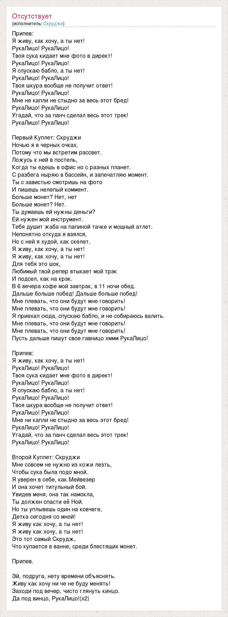 Припев: Я живу, как хочу, а ты нет! РукаЛицо! РукаЛицо! Твоя сука кидает мне фото в директ! РукаЛицо! РукаЛицо! Я спускаю бабло, а ты нет! РукаЛицо! РукаЛицо! Твоя шкура вообще не получит ответ! РукаЛицо! РукаЛицо! Мне не капли не стыдно за весь этот бред! РукаЛицо! РукаЛицо! Угадай, что за панч сделал весь этот трек! РукаЛицо! РукаЛицо! Первый Куплет: Скруджи Ночью я в черных очках, Потому что мы встретим рассвет. Ложусь к ней в постель, Когда ты едешь в офис но с разных планет. С разбега ныряю в бассейн, и запечатляю момент. Ты с завистью смотришь на фото И пишешь нелепый коммент. Больше монет? Нет, нет Больше монет? Нет. Ты думаешь ей нужны деньги? Ей нужен мой инструмент. Тебя душит жаба на папиной тачке и мощный атлет. Непонятно откуда я взялся, Но с ней я худой, как скелет. Я живу, как хочу, а ты нет! Я живу, как хочу, а ты нет! Для тебя это шок, Любимый твой репер втыкает мой трэк И подсел, как на крэк. В 6 вечера кофе мой завтрак, в 11 ночи обед. Дальше больше побед! Дальше больше побед! Мне плевать, что они будут мне говорить! Мне плевать, что они будут мне говорить! Я приехал сюда, спускаю бабло, и не собираюсь валить. Мне плевать, что они будут мне говорить! Мне плевать, что они будут мне говорить! Пусть дальше пишут свое гавницо хммм РукаЛицо! Припев: Я живу, как хочу, а ты нет! РукаЛицо! РукаЛицо! Твоя сука кидает мне фото в директ! РукаЛицо! РукаЛицо! Я спускаю бабло, а ты нет! РукаЛицо! РукаЛицо! Твоя шкура вообще не получит ответ! РукаЛицо! РукаЛицо! Мне ни капли не стыдно за весь этот бред! РукаЛицо! РукаЛицо! Угадай, что за панч сделал весь этот трек! РукаЛицо! РукаЛицо! Второй Куплет: Скруджи Мне совсем не нужно из кожи лезть, Чтобы сука была подо мной. Я уверен в себе, как Мейвезер И она хочет титульный бой. Увидев меня, она так намокла, Ты должен спасти её Ной. Но ты уплывешь один на ковчеге, Детка сегодня со мной! Я живу как хочу, а ты нет! Я живу как хочу, а ты нет! Это тот самый Скрудж, Что купается в ванне, среди блестящих монет. Припев. Эй, подруга, нету времени объяснять. Живу как хочу ни че не буду менять! Заходи под вечер, чисто глянуть кинцо. Да под винцо, РукаЛицо!(х2)