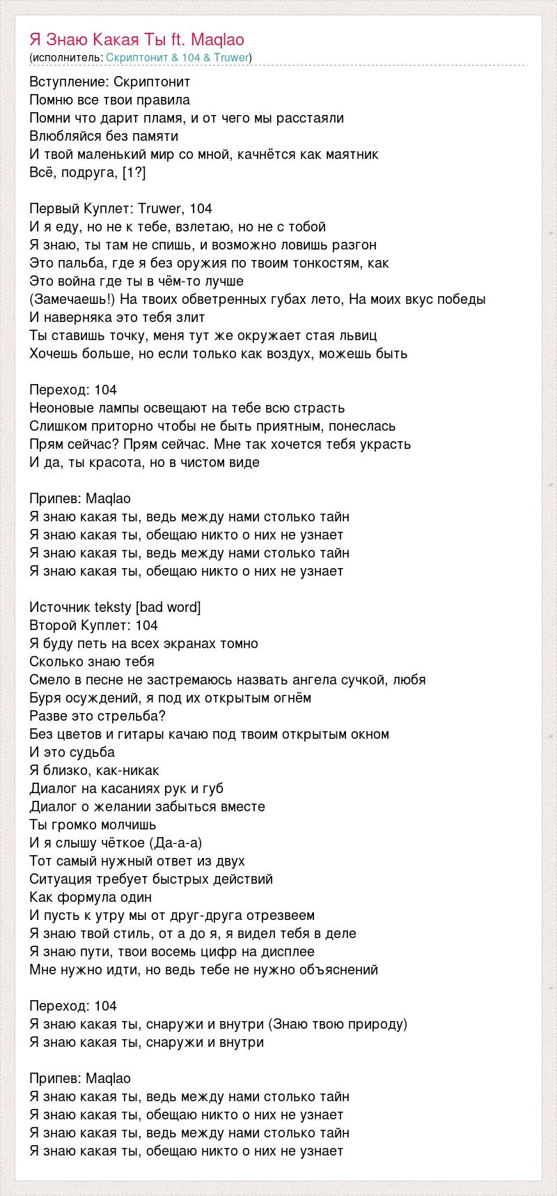 Вступление: Скриптонит Помню все твои правила Помни что дарит пламя, и от чего мы расстаяли Влюбляйся без памяти И твой маленький мир со мной, качнётся как маятник Всё, подруга, [1?] Первый Куплет: Truwer, 104 И я еду, но не к тебе, взлетаю, но не с тобой Я знаю, ты там не спишь, и возможно ловишь разгон Это пальба, где я без оружия по твоим тонкостям, как Это война где ты в чём-то лучше (Замечаешь!) На твоих обветренных губах лето, На моих вкус победы И наверняка это тебя злит Ты ставишь точку, меня тут же окружает стая львиц Хочешь больше, но если только как воздух, можешь быть Переход: 104 Неоновые лампы освещают на тебе всю страсть Слишком приторно чтобы не быть приятным, понеслась Прям сейчас? Прям сейчас. Мне так хочется тебя украсть И да, ты красота, но в чистом виде Припев: Maqlao Я знаю какая ты, ведь между нами столько тайн Я знаю какая ты, обещаю никто о них не узнает Я знаю какая ты, ведь между нами столько тайн Я знаю какая ты, обещаю никто о них не узнает Источник teksty [bad word] Второй Куплет: 104 Я буду петь на всех экранах томно Сколько знаю тебя Смело в песне не застремаюсь назвать ангела сучкой, любя Буря осуждений, я под их открытым огнём Разве это стрельба? Без цветов и гитары качаю под твоим открытым окном И это судьба Я близко, как-никак Диалог на касаниях рук и губ Диалог о желании забыться вместе Ты громко молчишь И я слышу чёткое (Да-а-а) Тот самый нужный ответ из двух Ситуация требует быстрых действий Как формула один И пусть к утру мы от друг-друга отрезвеем Я знаю твой стиль, от а до я, я видел тебя в деле Я знаю пути, твои восемь цифр на дисплее Мне нужно идти, но ведь тебе не нужно объяснений Переход: 104 Я знаю какая ты, снаружи и внутри (Знаю твою природу) Я знаю какая ты, снаружи и внутри Припев: Maqlao Я знаю какая ты, ведь между нами столько тайн Я знаю какая ты, обещаю никто о них не узнает Я знаю какая ты, ведь между нами столько тайн Я знаю какая ты, обещаю никто о них не узнает