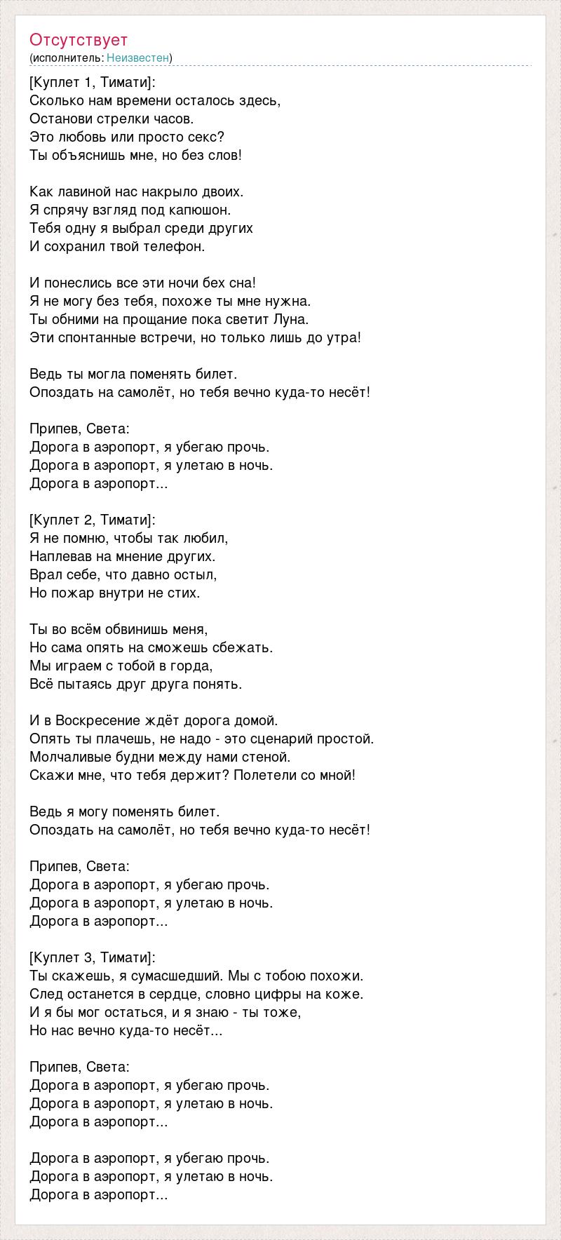 [Куплет 1, Тимати]: Сколько нам времени осталось здесь, Останови стрелки часов. Это любовь или просто секс? Ты объяснишь мне, но без слов! Как лавиной нас накрыло двоих. Я спрячу взгляд под капюшон. Тебя одну я выбрал среди других И сохранил твой телефон. И понеслись все эти ночи бех сна! Я не могу без тебя, похоже ты мне нужна. Ты обними на прощание пока светит Луна. Эти спонтанные встречи, но только лишь до утра! Ведь ты могла поменять билет. Опоздать на самолёт, но тебя вечно куда-то несёт! Припев, Света: Дорога в аэропорт, я убегаю прочь. Дорога в аэропорт, я улетаю в ночь. Дорога в аэропорт... [Куплет 2, Тимати]: Я не помню, чтобы так любил, Наплевав на мнение других. Врал себе, что давно остыл, Но пожар внутри не стих. Ты во всём обвинишь меня, Но сама опять на сможешь сбежать. Мы играем с тобой в горда, Всё пытаясь друг друга понять. И в Воскресение ждёт дорога домой. Опять ты плачешь, не надо - это сценарий простой. Молчаливые будни между нами стеной. Скажи мне, что тебя держит? Полетели со мной! Ведь я могу поменять билет. Опоздать на самолёт, но тебя вечно куда-то несёт! Припев, Света: Дорога в аэропорт, я убегаю прочь. Дорога в аэропорт, я улетаю в ночь. Дорога в аэропорт... [Куплет 3, Тимати]: Ты скажешь, я сумасшедший. Мы с тобою похожи. След останется в сердце, словно цифры на коже. И я бы мог остаться, и я знаю - ты тоже, Но нас вечно куда-то несёт... Припев, Света: Дорога в аэропорт, я убегаю прочь. Дорога в аэропорт, я улетаю в ночь. Дорога в аэропорт... Дорога в аэропорт, я убегаю прочь. Дорога в аэропорт, я улетаю в ночь. Дорога в аэропорт...