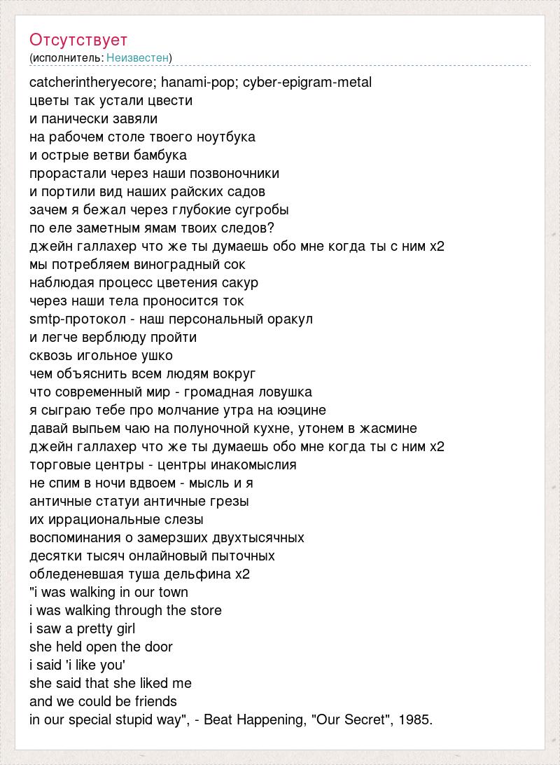 catcherintheryecore; hanami-pop; cyber-epigram-metal цветы так устали цвести и панически завяли на рабочем столе твоего ноутбука и острые ветви бамбука прорастали через наши позвоночники и портили вид наших райских садов зачем я бежал через глубокие сугробы по еле заметным ямам твоих следов? джейн галлахер что же ты думаешь обо мне когда ты с ним x2 мы потребляем виноградный сок наблюдая процесс цветения сакур через наши тела проносится ток smtp-протокол - наш персональный оракул и легче верблюду пройти сквозь игольное ушко чем объяснить всем людям вокруг что современный мир - громадная ловушка я сыграю тебе про молчание утра на юэцине давай выпьем чаю на полуночной кухне, утонем в жасмине джейн галлахер что же ты думаешь обо мне когда ты с ним x2 торговые центры - центры инакомыслия не спим в ночи вдвоем - мысль и я античные статуи античные грезы их иррациональные слезы воспоминания о замерзших двухтысячных десятки тысяч онлайновый пыточных обледеневшая туша дельфина x2 "i was walking in our town i was walking through the store i saw a pretty girl she held open the door i said 'i like you' she said that she liked me and we could be friends in our special stupid way", - Beat Happening, "Our Secret", 1985.