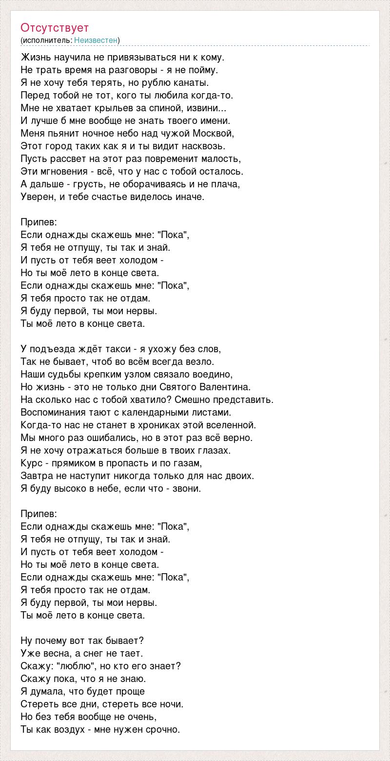 Жизнь научила не привязываться ни к кому. Не трать время на разговоры - я не пойму. Я не хочу тебя терять, но рублю канаты. Перед тобой не тот, кого ты любила когда-то. Мне не хватает крыльев за спиной, извини... И лучше б мне вообще не знать твоего имени. Меня пьянит ночное небо над чужой Москвой, Этот город таких как я и ты видит насквозь. Пусть рассвет на этот раз повременит малость, Эти мгновения - всё, что у нас с тобой осталось. А дальше - грусть, не оборачиваясь и не плача, Уверен, и тебе счастье виделось иначе. Припев: Если однажды скажешь мне: "Пока", Я тебя не отпущу, ты так и знай. И пусть от тебя веет холодом - Но ты моё лето в конце света. Если однажды скажешь мне: "Пока", Я тебя просто так не отдам. Я буду первой, ты мои нервы. Ты моё лето в конце света. У подъезда ждёт такси - я ухожу без слов, Так не бывает, чтоб во всём всегда везло. Наши судьбы крепким узлом связало воедино, Но жизнь - это не только дни Святого Валентина. На сколько нас с тобой хватило? Смешно представить. Воспоминания тают с календарными листами. Когда-то нас не станет в хрониках этой вселенной. Мы много раз ошибались, но в этот раз всё верно. Я не хочу отражаться больше в твоих глазах. Курс - прямиком в пропасть и по газам, Завтра не наступит никогда только для нас двоих. Я буду высоко в небе, если что - звони. Припев: Если однажды скажешь мне: "Пока", Я тебя не отпущу, ты так и знай. И пусть от тебя веет холодом - Но ты моё лето в конце света. Если однажды скажешь мне: "Пока", Я тебя просто так не отдам. Я буду первой, ты мои нервы. Ты моё лето в конце света. Ну почему вот так бывает? Уже весна, а снег не тает. Скажу: "люблю", но кто его знает? Скажу пока, что я не знаю. Я думала, что будет проще Стереть все дни, стереть все ночи. Но без тебя вообще не очень, Ты как воздух - мне нужен срочно.