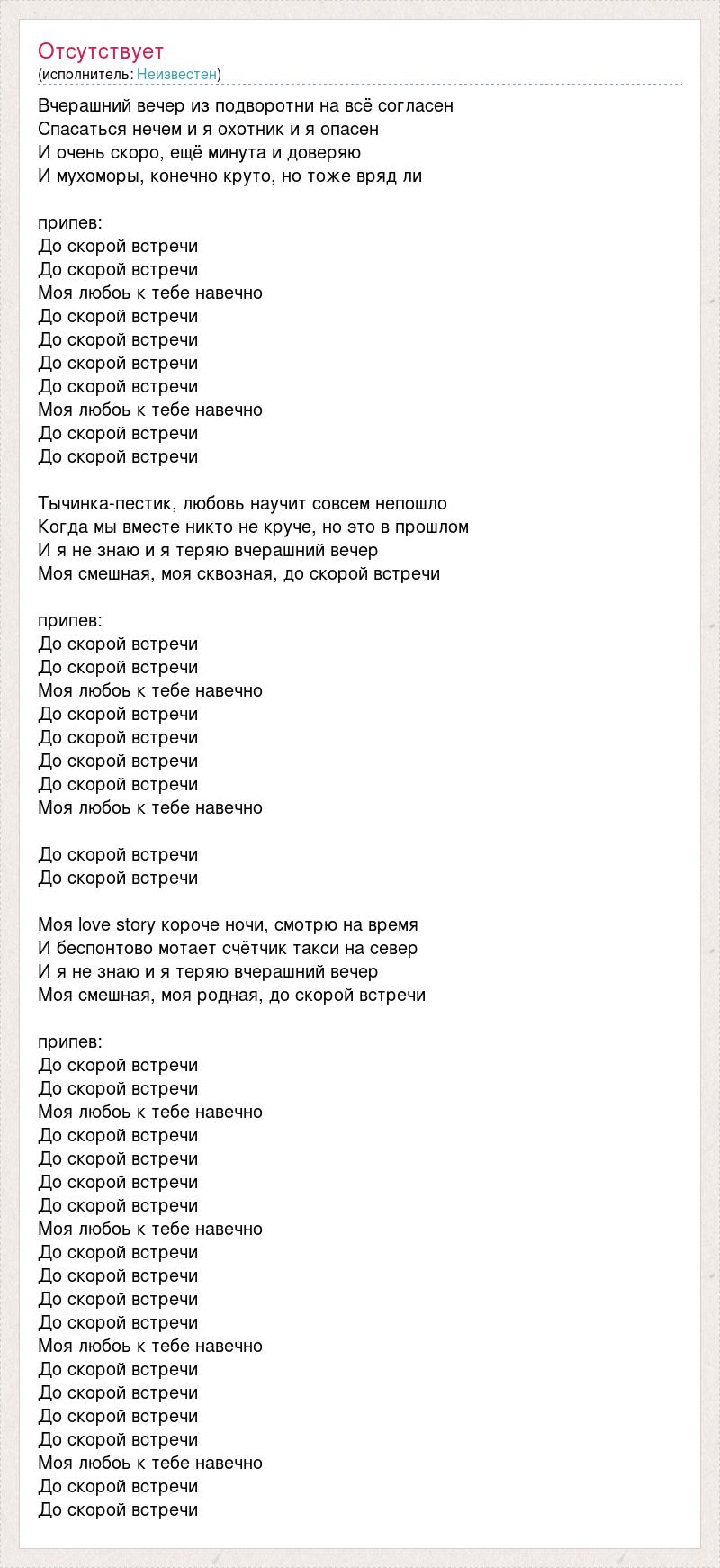 Вчерашний вечер из подворотни на всё согласен Спасаться нечем и я охотник и я опасен И очень скоро, ещё минута и доверяю И мухоморы, конечно круто, но тоже вряд ли припев: До скорой встречи До скорой встречи Моя любоь к тебе навечно До скорой встречи До скорой встречи До скорой встречи До скорой встречи Моя любоь к тебе навечно До скорой встречи До скорой встречи Тычинка-пестик, любовь научит совсем непошло Когда мы вместе никто не круче, но это в прошлом И я не знаю и я теряю вчерашний вечер Моя смешная, моя сквозная, до скорой встречи припев: До скорой встречи До скорой встречи Моя любоь к тебе навечно До скорой встречи До скорой встречи До скорой встречи До скорой встречи Моя любоь к тебе навечно До скорой встречи До скорой встречи Моя love story короче ночи, смотрю на время И беспонтово мотает счётчик такси на север И я не знаю и я теряю вчерашний вечер Моя смешная, моя родная, до скорой встречи припев: До скорой встречи До скорой встречи Моя любоь к тебе навечно До скорой встречи До скорой встречи До скорой встречи До скорой встречи Моя любоь к тебе навечно До скорой встречи До скорой встречи До скорой встречи До скорой встречи Моя любоь к тебе навечно До скорой встречи До скорой встречи До скорой встречи До скорой встречи Моя любоь к тебе навечно До скорой встречи До скорой встречи