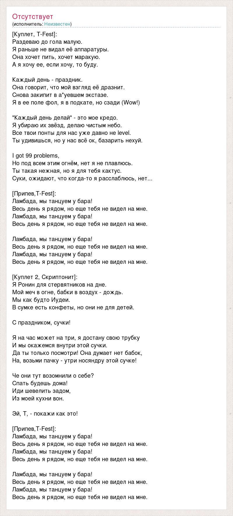 [Куплет, T-Fest]: Раздеваю до гола малую. Я раньше не видал её аппаратуры. Она хочет пить, хочет маракую. А я хочу ее, если хочу, то буду. Каждый день - праздник. Она говорит, что мой взгляд её дразнит. Снова закипит в а*уевшем экстазе. Я в ее поле фол, я в подкате, но сзади (Wow!) "Каждый день делай" - это мое кредо. Я убираю их звёзд, делаю чистым небо. Все твои понты для нас уже давно не level. Ты удивишься, но у нас всё ок, базарить нехуй. I got 99 problems, Но под всем этим огнём, нет я не плавлюсь. Ты такая нежная, но я для тебя кактус. Суки, ожидают, что когда-то я расслаблюсь, нет... [Припев,T-Fest]: Ламбада, мы танцуем у бара! Весь день я рядом, но еще тебя не видел на мне. Ламбада, мы танцуем у бара! Весь день я рядом, но еще тебя не видел на мне. Ламбада, мы танцуем у бара! Весь день я рядом, но еще тебя не видел на мне. Ламбада, мы танцуем у бара! Весь день я рядом, но еще тебя не видел на мне. [Куплет 2, Скриптонит]: Я Ронин для стервятников на дне. Мой меч в огне, бабки в воздух - дождь. Мы как будто Иудеи. В сумке есть конфеты, но они не для детей. С праздником, сучки! Я на час может на три, я достану свою трубку И мы окажемся внутри этой сучки. Да ты только посмотри! Она думает нет бабок, На, возьми пачку - утри носяндру этой сучке! Че они тут возомнили о себе? Спать будешь дома! Иди шевелить задом, Из моей кухни вон. Эй, Т, - покажи как это! [Припев,T-Fest]: Ламбада, мы танцуем у бара! Весь день я рядом, но еще тебя не видел на мне. Ламбада, мы танцуем у бара! Весь день я рядом, но еще тебя не видел на мне. Ламбада, мы танцуем у бара! Весь день я рядом, но еще тебя не видел на мне. Ламбада, мы танцуем у бара! Весь день я рядом, но еще тебя не видел на мне.