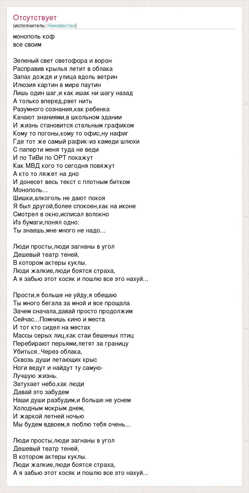 монополь коф все своим Зеленый свет светофора и ворон Расправив крылья летит в облака Запах дождя и улица вдоль ветрин Илюзия картин в мире паутин Лишь один шаг,и как ишак ни шагу назад А только вперед,рвет нить Разумного сознания,как ребенка Качают знаниями,в школьном здании И жизнь становится стальным графиком Кому то погоны,кому то офис,ну нафиг Где тот же самый рафик-из камеди шлюхи С паперти меня туда не веди И по ТиВи по ОРТ покажут Как МВД кого то сегодня повяжут А кто то ляжет на дно И донесет весь текст с плотным битком Монополь... Шишки,алкоголь не дают покоя Я был другой,более спокоен,как на иконе Смотрел в окно,исписал волокно Из бумаги,понял одно: Ты знаешь,мне много не надо... Люди просты,люди загнаны в угол Дешевый театр теней, В котором актеры куклы. Люди жалкие,люди боятся страха, А я забью этот косяк и пошлю все это нахуй... Прости,я больше не уйду,я обещаю Ты много бегала за мной и все прощала Зачем сначала,давай просто продолжим Сейчас...Помнишь кино и места И тот кто сидел на местах Массы серых лиц,как стаи бешеных птиц Перебирают перьями,летят за границу Убиться..Через облака, Сквозь души летающих крыс Ноги ведут и найдут ту самую- Лучшую жизнь. Затухает небо,как люди Давай это забудем Наши души разбудим,и больше не уснем Холодным мокрым днем, И жаркой летней ночью Мы будем вдвоем,я люблю тебя очень... Люди просты,люди загнаны в угол Дешевый театр теней, В котором актеры куклы. Люди жалкие,люди боятся страха, А я забью этот косяк и пошлю все это нахуй...
