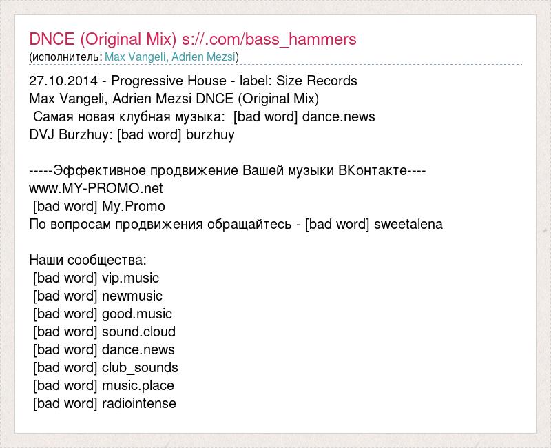 27.10.2014 - Progressive House - label: Size Records Max Vangeli, Adrien Mezsi DNCE (Original Mix) Самая новая клубная музыка: [bad word] dance.news DVJ Burzhuy: [bad word] burzhuy -----Эффективное продвижение Вашей музыки ВКонтакте---- www.MY-PROMO.net [bad word] My.Promo По вопросам продвижения oбращайтесь - [bad word] sweetalena Наши сообщества: [bad word] vip.music [bad word] newmusic [bad word] good.music [bad word] sound.cloud [bad word] dance.news [bad word] club_sounds [bad word] music.place [bad word] radiointense