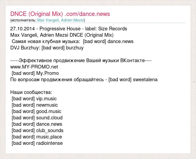 27.10.2014 - Progressive House - label: Size Records Max Vangeli, Adrien Mezsi DNCE (Original Mix) Самая новая клубная музыка: [bad word] dance.news DVJ Burzhuy: [bad word] burzhuy -----Эффективное продвижение Вашей музыки ВКонтакте---- www.MY-PROMO.net [bad word] My.Promo По вопросам продвижения oбращайтесь - [bad word] sweetalena Наши сообщества: [bad word] vip.music [bad word] newmusic [bad word] good.music [bad word] sound.cloud [bad word] dance.news [bad word] club_sounds [bad word] music.place [bad word] radiointense