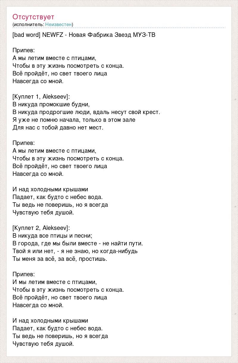 [bad word] NEWFZ - Новая Фабрика Звезд МУЗ-ТВ Припев: А мы летим вместе с птицами, Чтобы в эту жизнь посмотреть с конца. Всё пройдёт, но свет твоего лица Навсегда со мной. [Куплет 1, Alekseev]: В никуда промокшие будни, В никуда продрогшие люди, вдаль несут свой крест. Я уже не помню начала, только в этом зале Для нас с тобой давно нет мест. Припев: А мы летим вместе с птицами, Чтобы в эту жизнь посмотреть с конца. Всё пройдёт, но свет твоего лица Навсегда со мной. И над холодными крышами Падает, как будто с небес вода. Ты ведь не поверишь, но я всегда Чувствую тебя душой. [Куплет 2, Alekseev]: В никуда все птицы и песни; В города, где мы были вместе - не найти пути. Твой я или нет, - я не знаю, но когда-нибудь Ты меня за всё, за всё, простишь. Припев: И мы летим вместе с птицами, Чтобы в эту жизнь посмотреть с конца. Всё пройдёт, но свет твоего лица Навсегда со мной. И над холодными крышами Падает, как будто с небес вода. Ты ведь не поверишь, но я всегда Чувствую тебя душой.