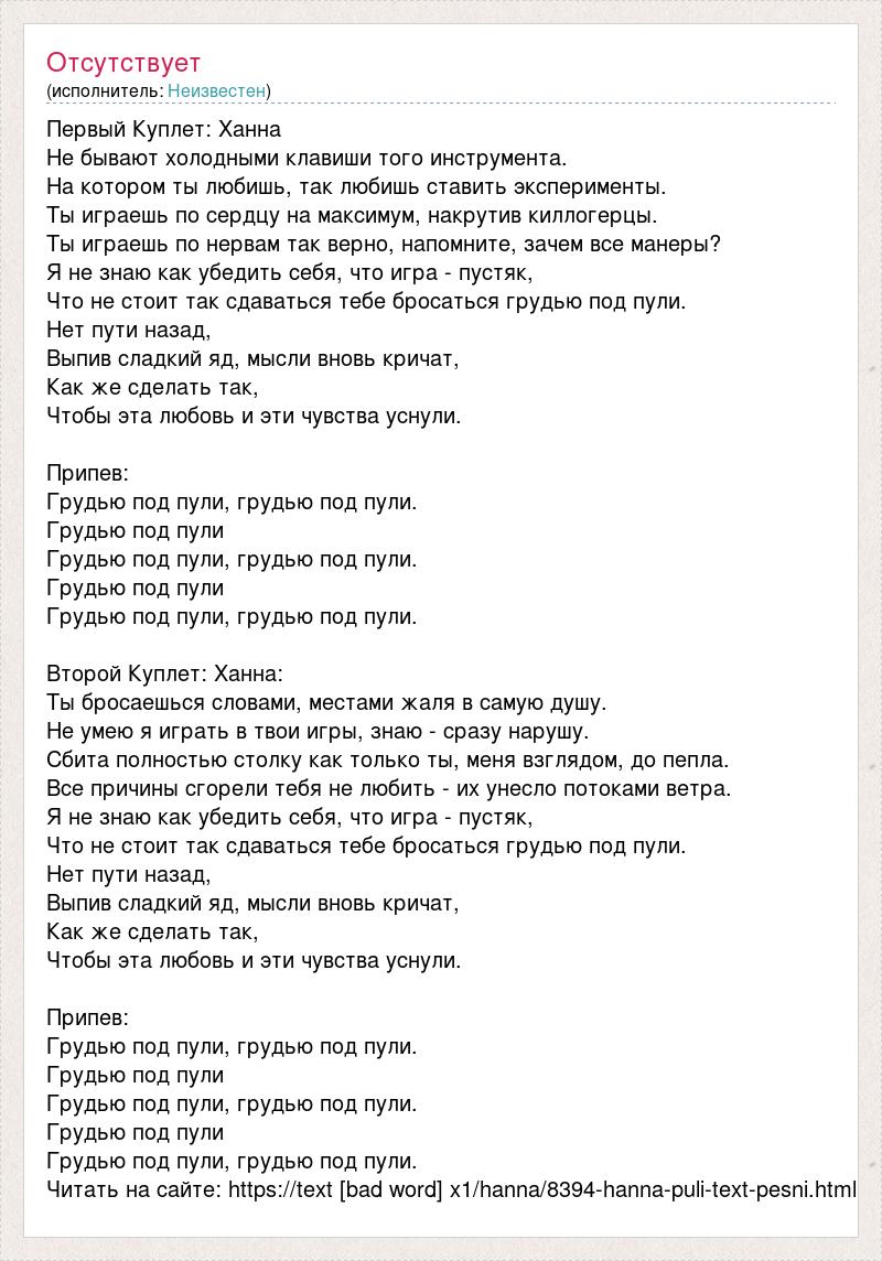 Первый Куплет: Ханна Не бывают холодными клавиши того инструмента. На котором ты любишь, так любишь ставить эксперименты. Ты играешь по сердцу на максимум, накрутив киллогерцы. Ты играешь по нервам так верно, напомните, зачем все манеры? Я не знаю как убедить себя, что игра - пустяк, Что не стоит так сдаваться тебе бросаться грудью под пули. Нет пути назад, Выпив сладкий яд, мысли вновь кричат, Как же сделать так, Чтобы эта любовь и эти чувства уснули. Припев: Грудью под пули, грудью под пули. Грудью под пули Грудью под пули, грудью под пули. Грудью под пули Грудью под пули, грудью под пули. Второй Куплет: Ханна: Ты бросаешься словами, местами жаля в самую душу. Не умею я играть в твои игры, знаю - сразу нарушу. Сбита полностью столку как только ты, меня взглядом, до пепла. Все причины сгорели тебя не любить - их унесло потоками ветра. Я не знаю как убедить себя, что игра - пустяк, Что не стоит так сдаваться тебе бросаться грудью под пули. Нет пути назад, Выпив сладкий яд, мысли вновь кричат, Как же сделать так, Чтобы эта любовь и эти чувства уснули. Припев: Грудью под пули, грудью под пули. Грудью под пули Грудью под пули, грудью под пули. Грудью под пули Грудью под пули, грудью под пули. Читать на сайте: https://text [bad word] x1/hanna/8394-hanna-puli-text-pesni.html