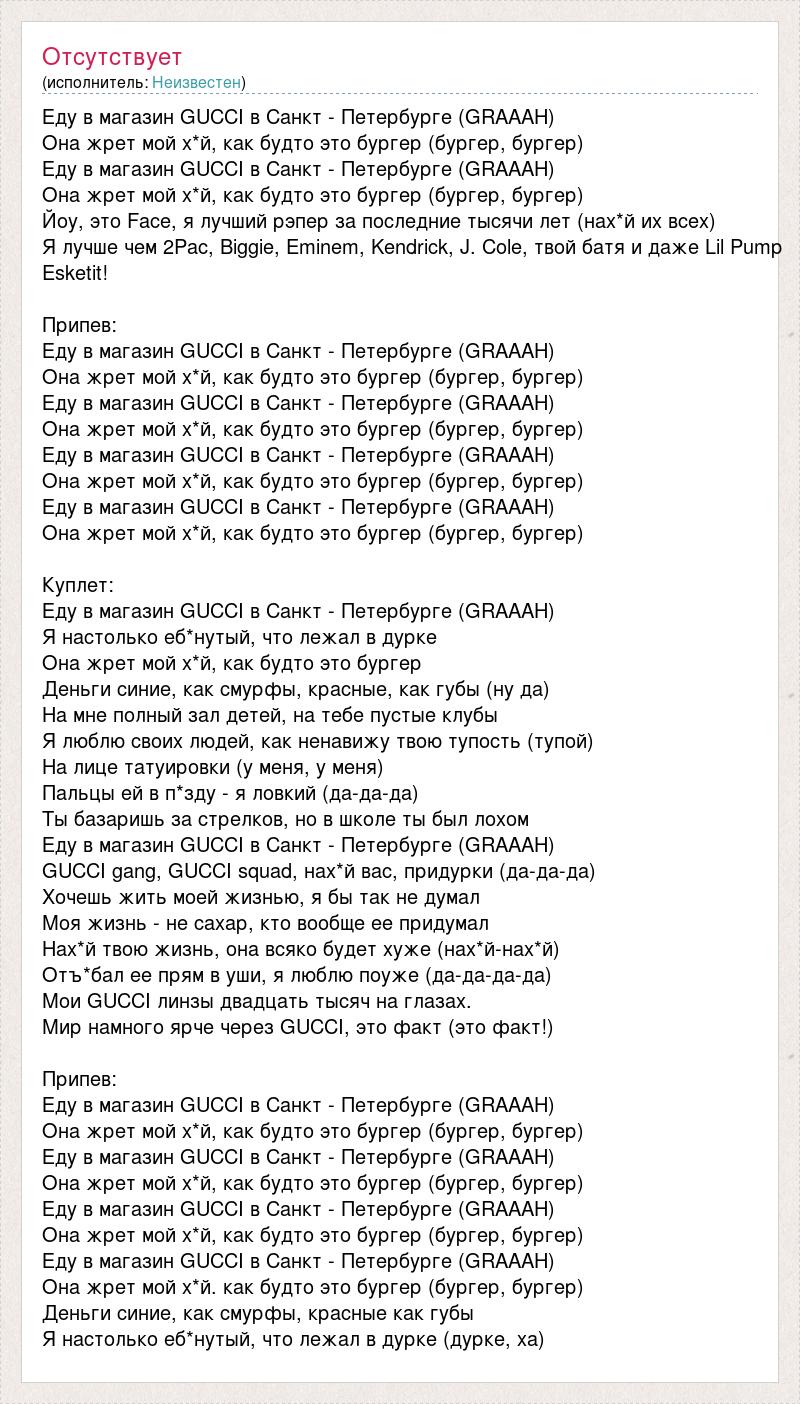 Еду в магазин GUCCI в Санкт - Петербурге (GRAAAH) Она жрет мой х*й, как будто это бургер (бургер, бургер) Еду в магазин GUCCI в Санкт - Петербурге (GRAAAH) Она жрет мой х*й, как будто это бургер (бургер, бургер) Йоу, это Face, я лучший рэпер за последние тысячи лет (нах*й их всех) Я лучше чем 2Pac, Biggie, Eminem, Kendrick, J. Cole, твой батя и даже Lil Pump Esketit! Припев: Еду в магазин GUCCI в Санкт - Петербурге (GRAAAH) Она жрет мой х*й, как будто это бургер (бургер, бургер) Еду в магазин GUCCI в Санкт - Петербурге (GRAAAH) Она жрет мой х*й, как будто это бургер (бургер, бургер) Еду в магазин GUCCI в Санкт - Петербурге (GRAAAH) Она жрет мой х*й, как будто это бургер (бургер, бургер) Еду в магазин GUCCI в Санкт - Петербурге (GRAAAH) Она жрет мой х*й, как будто это бургер (бургер, бургер) Куплет: Еду в магазин GUCCI в Санкт - Петербурге (GRAAAH) Я настолько еб*нутый, что лежал в дурке Она жрет мой х*й, как будто это бургер Деньги синие, как смурфы, красные, как губы (ну да) На мне полный зал детей, на тебе пустые клубы Я люблю своих людей, как ненавижу твою тупость (тупой) На лице татуировки (у меня, у меня) Пальцы ей в п*зду - я ловкий (да-да-да) Ты базаришь за стрелков, но в школе ты был лохом Еду в магазин GUCCI в Санкт - Петербурге (GRAAAH) GUCCI gang, GUCCI squad, нах*й вас, придурки (да-да-да) Хочешь жить моей жизнью, я бы так не думал Моя жизнь - не сахар, кто вообще ее придумал Нах*й твою жизнь, она всяко будет хуже (нах*й-нах*й) Отъ*бал ее прям в уши, я люблю поуже (да-да-да-да) Мои GUCCI линзы двадцать тысяч на глазах. Мир намного ярче через GUCCI, это факт (это факт!) Припев: Еду в магазин GUCCI в Санкт - Петербурге (GRAAAH) Она жрет мой х*й, как будто это бургер (бургер, бургер) Еду в магазин GUCCI в Санкт - Петербурге (GRAAAH) Она жрет мой х*й, как будто это бургер (бургер, бургер) Еду в магазин GUCCI в Санкт - Петербурге (GRAAAH) Она жрет мой х*й, как будто это бургер (бургер, бургер) Еду в магазин GUCCI в Санкт - Петербурге (GRAAAH) Она жрет мой х*й. как будто это бургер (бургер, бургер) Деньги синие, как смурфы, красные как губы Я настолько еб*нутый, что лежал в дурке (дурке, ха)