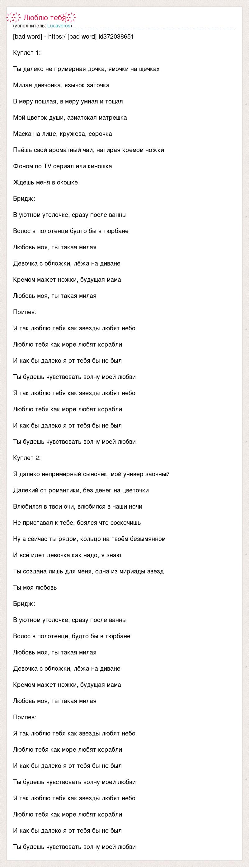 [bad word] - https:/ [bad word] id372038651 Куплет 1: Ты далеко не примерная дочка, ямочки на щечках Милая девчонка, язычок заточка В меру пошлая, в меру умная и тощая Мой цветок души, азиатская матрешка Маска на лице, кружева, сорочка Пьёшь свой ароматный чай, натирая кремом ножки Фоном по TV сериал или киношка Ждешь меня в окошке Бридж: В уютном уголочке, сразу после ванны Волос в полотенце будто бы в тюрбане Любовь моя, ты такая милая Девочка с обложки, лёжа на диване Кремом мажет ножки, будущая мама Любовь моя, ты такая милая Припев: Я так люблю тебя как звезды любят небо Люблю тебя как море любят корабли И как бы далеко я от тебя бы не был Ты будешь чувствовать волну моей любви Я так люблю тебя как звезды любят небо Люблю тебя как море любят корабли И как бы далеко я от тебя бы не был Ты будешь чувствовать волну моей любви Куплет 2: Я далеко непримерный сыночек, мой универ заочный Далекий от романтики, без денег на цветочки Влюбился в твои очи, влюбился в наши ночи Не приставал к тебе, боялся что соскочишь Ну а сейчас ты рядом, кольцо на твоём безымянном И всё идет девочка как надо, я знаю Ты создана лишь для меня, одна из мириады звезд Ты моя любовь Бридж: В уютном уголочке, сразу после ванны Волос в полотенце, будто бы в тюрбане Любовь моя, ты такая милая Девочка с обложки, лёжа на диване Кремом мажет ножки, будущая мама Любовь моя, ты такая милая Припев: Я так люблю тебя как звезды любят небо Люблю тебя как море любят корабли И как бы далеко я от тебя бы не был Ты будешь чувствовать волну моей любви Я так люблю тебя как звезды любят небо Люблю тебя как море любят корабли И как бы далеко я от тебя бы не был Ты будешь чувствовать волну моей любви