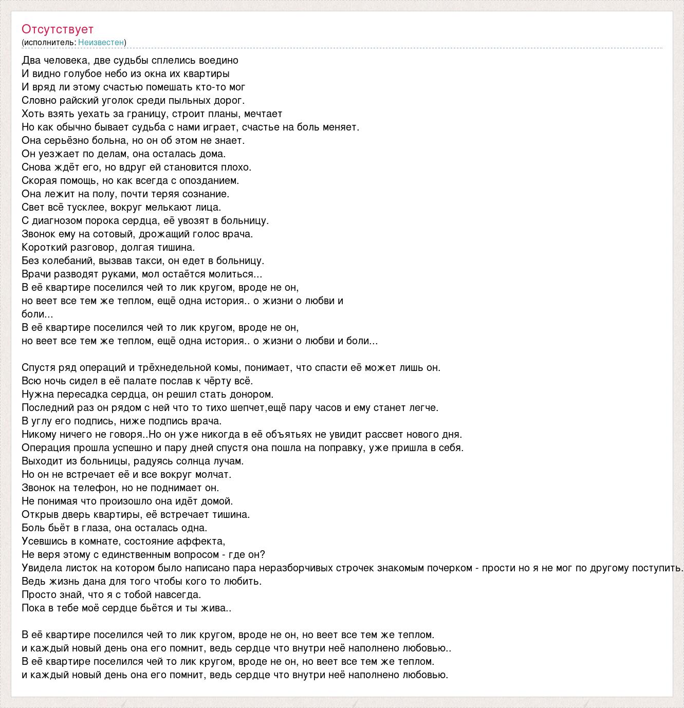 Два человека, две судьбы сплелись воедино И видно голубое небо из окна их квартиры И вряд ли этому счастью помешать кто-то мог Словно райский уголок среди пыльных дорог. Хоть взять уехать за границу, строит планы, мечтает Но как обычно бывает судьба с нами играет, счастье на боль меняет. Она серьёзно больна, но он об этом не знает. Он уезжает по делам, она осталась дома. Снова ждёт его, но вдруг ей становится плохо. Скорая помощь, но как всегда с опозданием. Она лежит на полу, почти теряя сознание. Свет всё тусклее, вокруг мелькают лица. С диагнозом порока сердца, её увозят в больницу. Звонок ему на сотовый, дрожащий голос врача. Короткий разговор, долгая тишина. Без колебаний, вызвав такси, он едет в больницу. Врачи разводят руками, мол остаётся молиться... В её квартире поселился чей то лик кругом, вроде не он, но веет все тем же теплом, ещё одна история.. о жизни о любви и боли... В её квартире поселился чей то лик кругом, вроде не он, но веет все тем же теплом, ещё одна история.. о жизни о любви и боли... Спустя ряд операций и трёхнедельной комы, понимает, что спасти её может лишь он. Всю ночь сидел в её палате послав к чёрту всё. Нужна пересадка сердца, он решил стать донором. Последний раз он рядом с ней что то тихо шепчет,ещё пару часов и ему станет легче. В углу его подпись, ниже подпись врача. Никому ничего не говоря..Но он уже никогда в её объятьях не увидит рассвет нового дня. Операция прошла успешно и пару дней спустя она пошла на поправку, уже пришла в себя. Выходит из больницы, радуясь солнца лучам. Но он не встречает её и все вокруг молчат. Звонок на телефон, но не поднимает он. Не понимая что произошло она идёт домой. Открыв дверь квартиры, её встречает тишина. Боль бьёт в глаза, она осталась одна. Усевшись в комнате, состояние аффекта, Не веря этому с единственным вопросом - где он? Увидела листок на котором было написано пара неразборчивых строчек знакомым почерком - прости но я не мог по другому поступить. Ведь жизнь дана для того чтобы кого то любить. Просто знай, что я с тобой навсегда. Пока в тебе моё сердце бьётся и ты жива.. В её квартире поселился чей то лик кругом, вроде не он, но веет все тем же теплом. и каждый новый день она его помнит, ведь сердце что внутри неё наполнено любовью.. В её квартире поселился чей то лик кругом, вроде не он, но веет все тем же теплом. и каждый новый день она его помнит, ведь сердце что внутри неё наполнено любовью.