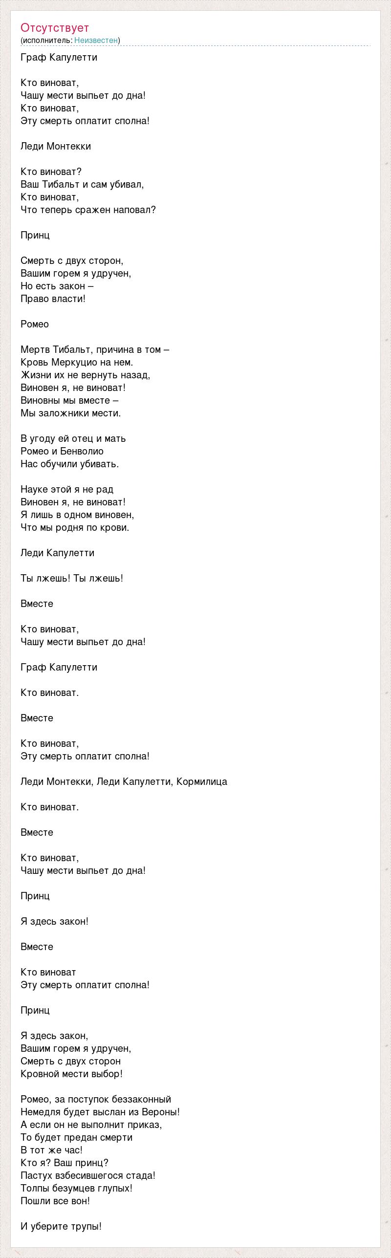 Граф Капулетти Кто виноват, Чашу мести выпьет до дна! Кто виноват, Эту смерть оплатит сполна! Леди Монтекки Кто виноват? Ваш Тибальт и сам убивал, Кто виноват, Что теперь сражен наповал? Принц Смерть с двух сторон, Вашим горем я удручен, Но есть закон – Право власти! Ромео Мертв Тибальт, причина в том – Кровь Меркуцио на нем. Жизни их не вернуть назад, Виновен я, не виноват! Виновны мы вместе – Мы заложники мести. В угоду ей отец и мать Ромео и Бенволио Нас обучили убивать. Науке этой я не рад Виновен я, не виноват! Я лишь в одном виновен, Что мы родня по крови. Леди Капулетти Ты лжешь! Ты лжешь! Вместе Кто виноват, Чашу мести выпьет до дна! Граф Капулетти Кто виноват. Вместе Кто виноват, Эту смерть оплатит сполна! Леди Монтекки, Леди Капулетти, Кормилица Кто виноват. Вместе Кто виноват, Чашу мести выпьет до дна! Принц Я здесь закон! Вместе Кто виноват Эту смерть оплатит сполна! Принц Я здесь закон, Вашим горем я удручен, Смерть с двух сторон Кровной мести выбор! Ромео, за поступок беззаконный Немедля будет выслан из Вероны! А если он не выполнит приказ, То будет предан смерти В тот же час! Кто я? Ваш принц? Пастух взбесившегося стада! Толпы безумцев глупых! Пошли все вон! И уберите трупы!