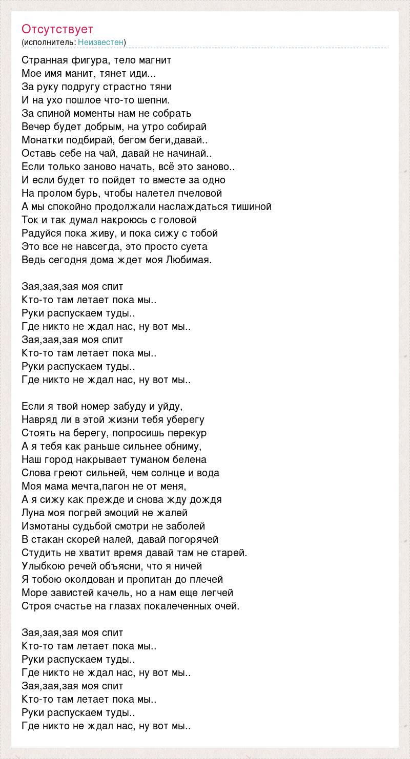 Странная фигура, тело магнит Мое имя манит, тянет иди... За руку подругу страстно тяни И на ухо пошлое что-то шепни. За спиной моменты нам не собрать Вечер будет добрым, на утро собирай Монатки подбирай, бегом беги,давай.. Оставь себе на чай, давай не начинай.. Если только заново начать, всё это заново.. И если будет то пойдет то вместе за одно На пролом бурь, чтобы налетел пчеловой А мы спокойно продолжали наслаждаться тишиной Ток и так думал накроюсь с головой Радуйся пока живу, и пока сижу с тобой Это все не навсегда, это просто суета Ведь сегодня дома ждет моя Любимая. Зая,зая,зая моя спит Кто-то там летает пока мы.. Руки распускаем туды.. Где никто не ждал нас, ну вот мы.. Зая,зая,зая моя спит Кто-то там летает пока мы.. Руки распускаем туды.. Где никто не ждал нас, ну вот мы.. Если я твой номер забуду и уйду, Навряд ли в этой жизни тебя уберегу Стоять на берегу, попросишь перекур А я тебя как раньше сильнее обниму, Наш город накрывает туманом белена Слова греют сильней, чем солнце и вода Моя мама мечта,пагон не от меня, А я сижу как прежде и снова жду дождя Луна моя погрей эмоций не жалей Измотаны судьбой смотри не заболей В стакан скорей налей, давай погорячей Студить не хватит время давай там не старей. Улыбкою речей объясни, что я ничей Я тобою околдован и пропитан до плечей Море завистей качель, но а нам еще легчей Строя счастье на глазах покалеченных очей. Зая,зая,зая моя спит Кто-то там летает пока мы.. Руки распускаем туды.. Где никто не ждал нас, ну вот мы.. Зая,зая,зая моя спит Кто-то там летает пока мы.. Руки распускаем туды.. Где никто не ждал нас, ну вот мы..