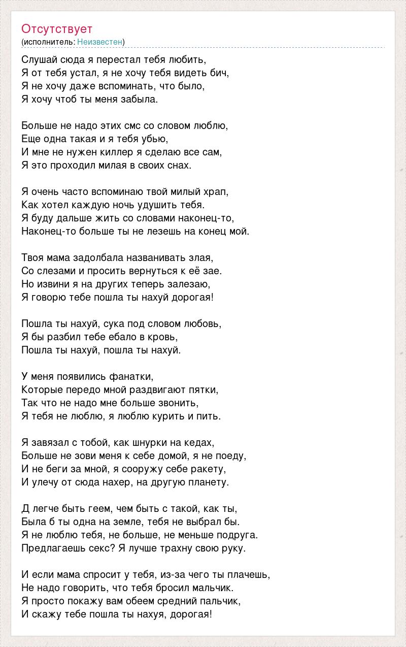 Слушай сюда я перестал тебя любить, Я от тебя устал, я не хочу тебя видеть бич, Я не хочу даже вспоминать, что было, Я хочу чтоб ты меня забыла. Больше не надо этих смс со словом люблю, Еще одна такая и я тебя убью, И мне не нужен киллер я сделаю все сам, Я это проходил милая в своих снах. Я очень часто вспоминаю твой милый храп, Как хотел каждую ночь удушить тебя. Я буду дальше жить со словами наконец-то, Наконец-то больше ты не лезешь на конец мой. Твоя мама задолбала названивать злая, Со слезами и просить вернуться к её зае. Но извини я на других теперь залезаю, Я говорю тебе пошла ты нахуй дорогая! Пошла ты нахуй, сука под словом любовь, Я бы разбил тебе ебало в кровь, Пошла ты нахуй, пошла ты нахуй. У меня появились фанатки, Которые передо мной раздвигают пятки, Так что не надо мне больше звонить, Я тебя не люблю, я люблю курить и пить. Я завязал с тобой, как шнурки на кедах, Больше не зови меня к себе домой, я не поеду, И не беги за мной, я сооружу себе ракету, И улечу от сюда нахер, на другую планету. Д легче быть геем, чем быть с такой, как ты, Была б ты одна на земле, тебя не выбрал бы. Я не люблю тебя, не больше, не меньше подруга. Предлагаешь секс? Я лучше трахну свою руку. И если мама спросит у тебя, из-за чего ты плачешь, Не надо говорить, что тебя бросил мальчик. Я просто покажу вам обеем средний пальчик, И скажу тебе пошла ты нахуя, дорогая!
