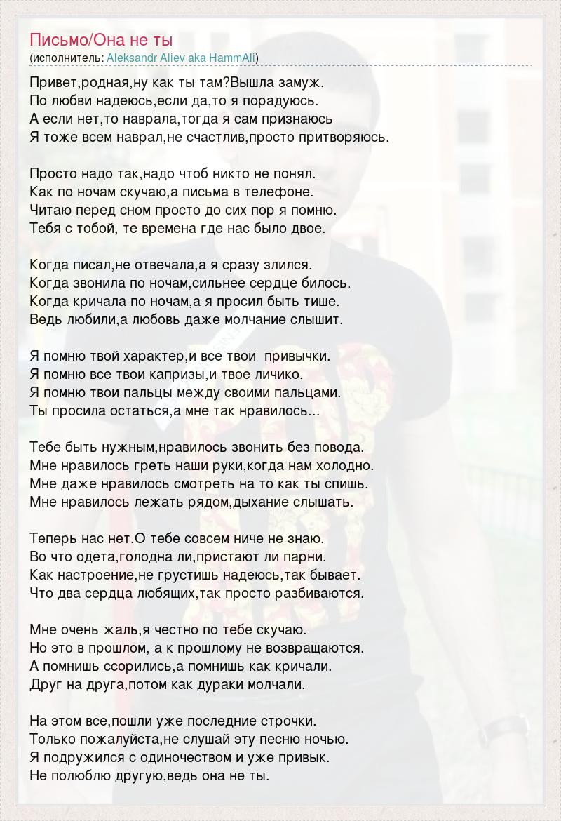 Привет,родная,ну как ты там?Вышла замуж. По любви надеюсь,если да,то я порадуюсь. А если нет,то наврала,тогда я сам признаюсь Я тоже всем наврал,не счастлив,просто притворяюсь. Просто надо так,надо чтоб никто не понял. Как по ночам скучаю,а письма в телефоне. Читаю перед сном просто до сих пор я помню. Тебя с тобой, те времена где нас было двое. Когда писал,не отвечала,а я сразу злился. Когда звонила по ночам,сильнее сердце билось. Когда кричала по ночам,а я просил быть тише. Ведь любили,а любовь даже молчание слышит. Я помню твой характер,и все твои привычки. Я помню все твои капризы,и твое личико. Я помню твои пальцы между своими пальцами. Ты просила остаться,а мне так нравилось... Тебе быть нужным,нравилось звонить без повода. Мне нравилось греть наши руки,когда нам холодно. Мне даже нравилось смотреть на то как ты спишь. Мне нравилось лежать рядом,дыхание слышать. Теперь нас нет.О тебе совсем ниче не знаю. Во что одета,голодна ли,пристают ли парни. Как настроение,не грустишь надеюсь,так бывает. Что два сердца любящих,так просто разбиваются. Мне очень жаль,я честно по тебе скучаю. Но это в прошлом, а к прошлому не возвращаются. А помнишь ссорились,а помнишь как кричали. Друг на друга,потом как дураки молчали. На этом все,пошли уже последние строчки. Только пожалуйста,не слушай эту песню ночью. Я подружился с одиночеством и уже привык. Не полюблю другую,ведь она не ты.