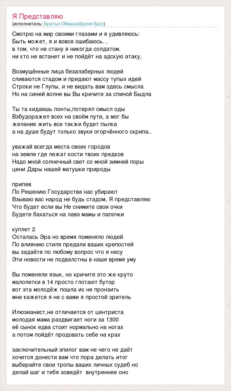 Смотрю на мир своими глазами и я удивляюсь: Быть может, я и вовсе ошибаюсь… в том, что не стану я никогда солдатом. ни кто не встанет и не пойдёт на адскую атаку, Возмущённые лица безалаберных людей сливаются стадом и придают массу тупых идей Строки не Глупы, и не видать вам здесь смысла Но на синей волне вы Вы кричите за спиной Быдла Ты та кидаешь понты,потерял смысл оды Взбудоражел всех на своём пути, а мог бы желание жить все также будет пылка а на душе будут только звуки огорчённого скрипа.. уважай всегда места своих городов на земле где лежат кости твоих предков Надо мной солнечный свет со мной зимней поры цени Дары нашей матушки природы припев По Решению Государства нас убирают Взываю вас народ не будь стадом, Я представляю Что будет если вы Не снимите свои очки Будете бахаться на лавэ мамы и папочки куплет 2 Осталась Эра но время поменяло людей По влиянию стиля предали ваших крепостей вы задаёте по любому вопрос что я несу Эти новости не подвалстны в наше время уму Вы поменяли язык, но кричите это же круто малолетки в 14 просто глотают бутор вот эта молодёж пошла их не пронзить мне кажется я не с вами я простой зритель Илюзианист,не отличается от центриста молодая мама раздвигает ноги за 1300 её сынок едва стоит нормально на ногах а потом пойдёт продовать себе на крах заключительный эпилог вам не чего не даёт хочется донести вам что пора делать итог выберайте свои тропы ваших личных судеб но делай шаг и тебя зоведёт внутреннее оно
