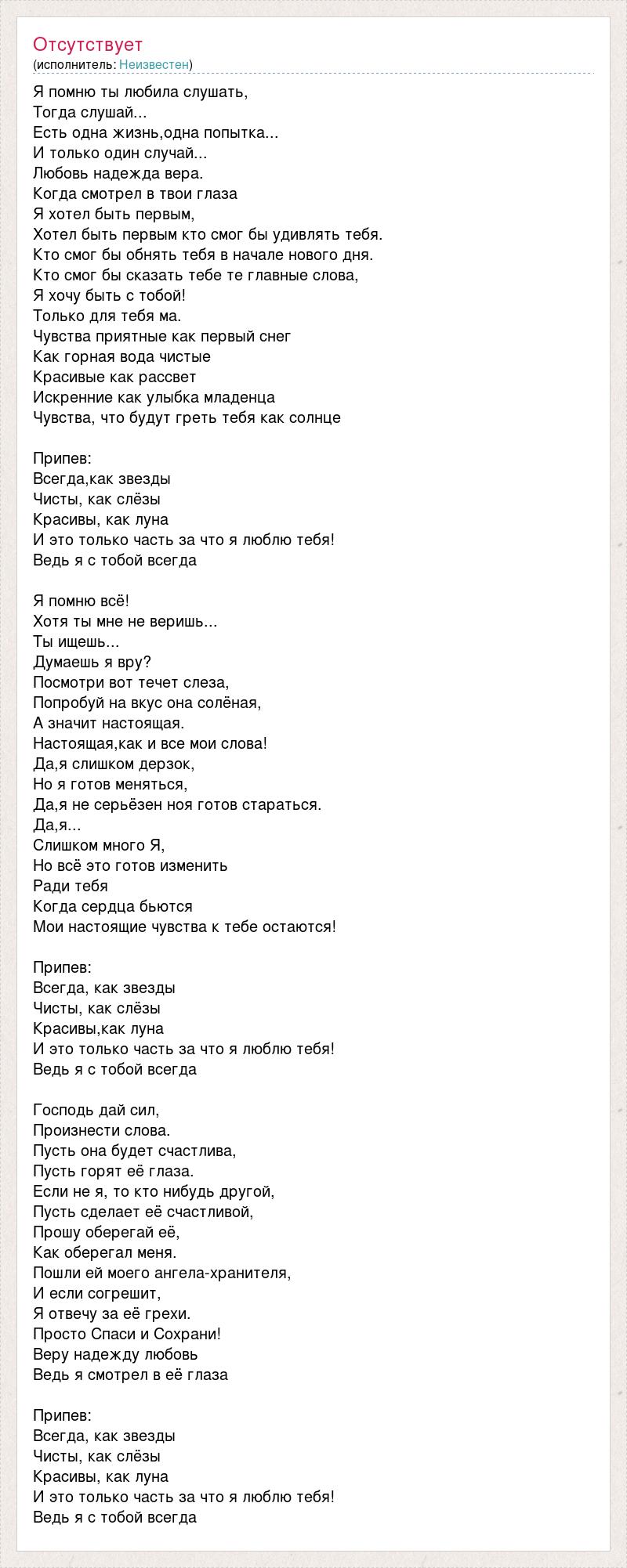 Я помню ты любила слушать, Тогда слушай... Есть одна жизнь,одна попытка... И только один случай... Любовь надежда вера. Когда смотрел в твои глаза Я хотел быть первым, Хотел быть первым кто смог бы удивлять тебя. Кто смог бы обнять тебя в начале нового дня. Кто смог бы сказать тебе те главные слова, Я хочу быть с тобой! Только для тебя ма. Чувства приятные как первый снег Как горная вода чистые Красивые как рассвет Искренние как улыбка младенца Чувства, что будут греть тебя как солнце Припев: Всегда,как звезды Чисты, как слёзы Красивы, как луна И это только часть за что я люблю тебя! Ведь я с тобой всегда Я помню всё! Хотя ты мне не веришь... Ты ищешь... Думаешь я вру? Посмотри вот течет слеза, Попробуй на вкус она солёная, А значит настоящая. Настоящая,как и все мои слова! Да,я слишком дерзок, Но я готов меняться, Да,я не серьёзен ноя готов стараться. Да,я... Слишком много Я, Но всё это готов изменить Ради тебя Когда сердца бьются Мои настоящие чувства к тебе остаются! Припев: Всегда, как звезды Чисты, как слёзы Красивы,как луна И это только часть за что я люблю тебя! Ведь я с тобой всегда Господь дай сил, Произнести слова. Пусть она будет счастлива, Пусть горят её глаза. Если не я, то кто нибудь другой, Пусть сделает её счастливой, Прошу оберегай её, Как оберегал меня. Пошли ей моего ангела-хранителя, И если согрешит, Я отвечу за её грехи. Просто Спаси и Сохрани! Веру надежду любовь Ведь я смотрел в её глаза Припев: Всегда, как звезды Чисты, как слёзы Красивы, как луна И это только часть за что я люблю тебя! Ведь я с тобой всегда
