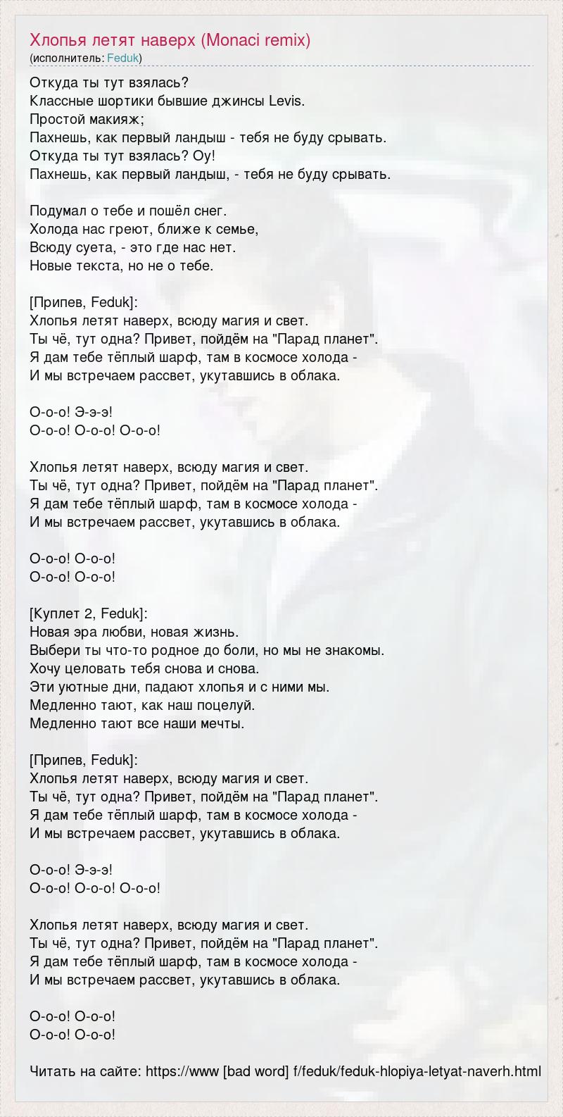 Откуда ты тут взялась? Классные шортики бывшие джинсы Levis. Простой макияж; Пахнешь, как первый ландыш - тебя не буду срывать. Откуда ты тут взялась? Оу! Пахнешь, как первый ландыш, - тебя не буду срывать. Подумал о тебе и пошёл снег. Холода нас греют, ближе к семье, Всюду суета, - это где нас нет. Новые текста, но не о тебе. [Припев, Feduk]: Хлопья летят наверх, всюду магия и свет. Ты чё, тут одна? Привет, пойдём на "Парад планет". Я дам тебе тёплый шарф, там в космосе холода - И мы встречаем рассвет, укутавшись в облака. О-о-о! Э-э-э! О-о-о! О-о-о! О-о-о! Хлопья летят наверх, всюду магия и свет. Ты чё, тут одна? Привет, пойдём на "Парад планет". Я дам тебе тёплый шарф, там в космосе холода - И мы встречаем рассвет, укутавшись в облака. О-о-о! О-о-о! О-о-о! О-о-о! [Куплет 2, Feduk]: Новая эра любви, новая жизнь. Выбери ты что-то родное до боли, но мы не знакомы. Хочу целовать тебя снова и снова. Эти уютные дни, падают хлопья и с ними мы. Медленно тают, как наш поцелуй. Медленно тают все наши мечты. [Припев, Feduk]: Хлопья летят наверх, всюду магия и свет. Ты чё, тут одна? Привет, пойдём на "Парад планет". Я дам тебе тёплый шарф, там в космосе холода - И мы встречаем рассвет, укутавшись в облака. О-о-о! Э-э-э! О-о-о! О-о-о! О-о-о! Хлопья летят наверх, всюду магия и свет. Ты чё, тут одна? Привет, пойдём на "Парад планет". Я дам тебе тёплый шарф, там в космосе холода - И мы встречаем рассвет, укутавшись в облака. О-о-о! О-о-о! О-о-о! О-о-о! Читать на сайте: https://www [bad word] f/feduk/feduk-hlopiya-letyat-naverh.html