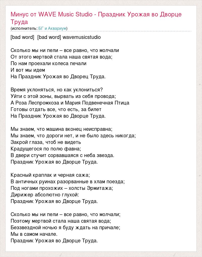 [bad word] [bad word] wavemusicstudio Сколько мы ни пели – все равно, что молчали От этого мертвой стала наша святая вода; По нам проехали колеса печали И вот мы идем На Праздник Урожая во Дворец Труда. Время уклоняться, но как уклониться? Уйти с этой зоны, вырвать из себя провода; А Роза Леспромхоза и Мария Подвенечная Птица Готовы отдать все, что есть, за билет На Праздник Урожая во Дворце Труда. Мы знаем, что машина вконец неисправна; Мы знаем, что дороги нет, и не было здесь никогда; Закрой глаза, чтоб не видеть Крадущегося по полю фавна; В двери стучит сорвавшаяся с неба звезда. Праздник Урожая во Дворце Труда. Красный краплак и черная сажа; В античных руинах разорванные в хлам поезда; Под ногами прохожих – холсты Эрмитажа; Дирижер абсолютно глухой: Праздник Урожая во Дворце Труда. Сколько мы ни пели – все равно, что молчали; Поэтому мертвой стала наша святая вода; Беззвездной ночью я буду ждать на причале; Мы в самом начале. Праздник Урожая во Дворце Труда.