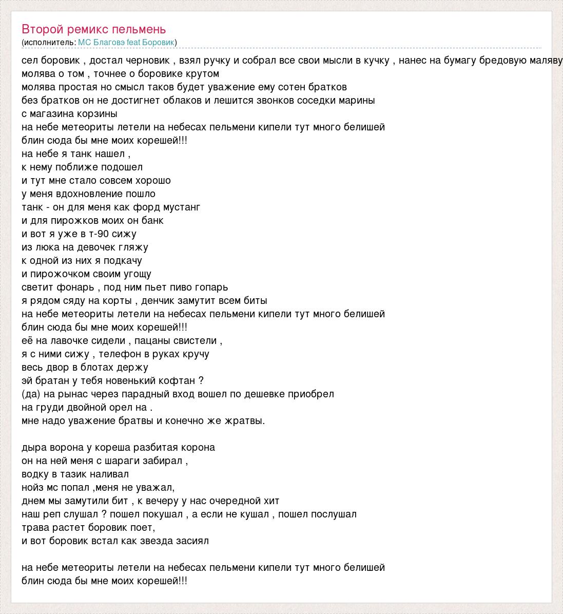 сел боровик , достал черновик , взял ручку и собрал все свои мысли в кучку , нанес на бумагу бредовую маляву молява о том , точнее о боровике крутом молява простая но смысл таков будет уважение ему сотен братков без братков он не достигнет облаков и лешится звонков соседки марины с магазина корзины на небе метеориты летели на небесах пельмени кипели тут много белишей блин сюда бы мне моих корешей!!! на небе я танк нашел , к нему поближе подошел и тут мне стало совсем хорошо у меня вдохновление пошло танк - он для меня как форд мустанг и для пирожков моих он банк и вот я уже в т-90 сижу из люка на девочек гляжу к одной из них я подкачу и пирожочком своим угощу светит фонарь , под ним пьет пиво гопарь я рядом сяду на корты , денчик замутит всем биты на небе метеориты летели на небесах пельмени кипели тут много белишей блин сюда бы мне моих корешей!!! её на лавочке сидели , пацаны свистели , я с ними сижу , телефон в руках кручу весь двор в блотах держу эй братан у тебя новенький кофтан ? (да) на рынас через парадный вход вошел по дешевке приобрел на груди двойной орел на . мне надо уважение братвы и конечно же жратвы. дыра ворона у кореша разбитая корона он на ней меня с шараги забирал , водку в тазик наливал нойз мс попал ,меня не уважал, днем мы замутили бит , к вечеру у нас очередной хит наш реп слушал ? пошел покушал , а если не кушал , пошел послушал трава растет боровик поет, и вот боровик встал как звезда засиял на небе метеориты летели на небесах пельмени кипели тут много белишей блин сюда бы мне моих корешей!!!