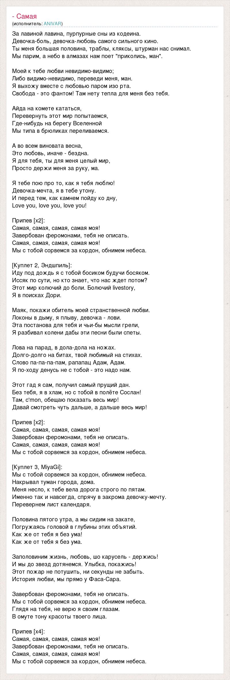 За лавиной лавина, пурпурные сны из кодеина. Девочка-боль, девочка-любовь самого сильного кино. Ты меня большая половина, траблы, кляксы, штурман нас снимал. Мы парим, а небо в алмазах нам поет "приколись, ман". Моей к тебе любви невидимо-видимо; Либо видимо-невидимо, переведи меня, ман. Я выхожу вместе с любовью паром изо рта. Свобода - это фантом! Там нету тепла для меня без тебя. Айда на комете кататься, Перевернуть этот мир попытаемся, Где-нибудь на берегу Вселенной Мы типа в брюликах переливаемся. А во всем виновата весна, Это любовь, иначе - бездна. Я для тебя, ты для меня целый мир, Просто держи меня за руку, ма. Я тебе пою про то, как я тебя люблю! Девочка-мечта, я в тебе утону. И перед тем, как камнем пойду ко дну, Love you, love you, love you! Припев [х2]: Самая, самая, самая, самая моя! Завербован феромонами, тебя не описать. Самая, самая, самая, самая моя! Мы с тобой сорвемся за кордон, обнимем небеса. [Куплет 2, Эндшпиль]: Иду под дождь я с тобой босиком будучи босяком. Иссяк по сути, но кто знает, что нас ждет потом? Этот мир колючий до боли. Болючий livestory, Я в поисках Дори. Маяк, покажи обитель моей странственной любви. Локоны в дыму, я плыву, девочка - лови. Эта постанова для тебя и чьи-бы мысли грели, Я разбивал колени дабы эти песни были спеты. Лова на парад, в дола-дола на ножах. Долго-долго на битах, твой любимый на стихах. Слово па-па-па-пам, рапапац Адам, Адам. Я по-ходу денусь не с тобой - это надо нам. Этот гад я сам, получил самый прущий дан. Без тебя, я в хлам, но с тобой в полёте Сослан! Там, c'mon, обещаю показать весь мир! Давай смотреть чуть дальше, а дальше весь мир! Припев [х2]: Самая, самая, самая, самая моя! Завербован феромонами, тебя не описать. Самая, самая, самая, самая моя! Мы с тобой сорвемся за кордон, обнимем небеса. [Куплет 3, MiyaGi]: Мы с тобой сорвемся за кордон, обнимем небеса. Накрывал туман города, дома. Меня несло, к тебе вела дорога строго по пятам. Именно так и навсегда, спрячу в закрома девочку-мечту. Перевернем лист календаря. Половина пятого утра, а мы сидим на закате, Погружаясь головой в глубины этих объятий. Как же от тебя я без ума! Как же от тебя я без ума. Заполовиним жизнь, любовь, шо карусель - держись! И мы до звезд дотянемся. Улыбка, покажись! Этот пожар не потушить, ни секунды не забыть. История любви, мы прямо у Фаса-Сара. Завербован феромонами, тебя не описать. Мы с тобой сорвемся за кордон, обнимем небеса. Глядя на тебя, не верю я своим глазам. В омуте тону красоты твоего лица. Припев [х4]: Самая, самая, самая, самая моя! Завербован феромонами, тебя не описать. Самая, самая, самая, самая моя! Мы с тобой сорвемся за кордон, обнимем небеса.