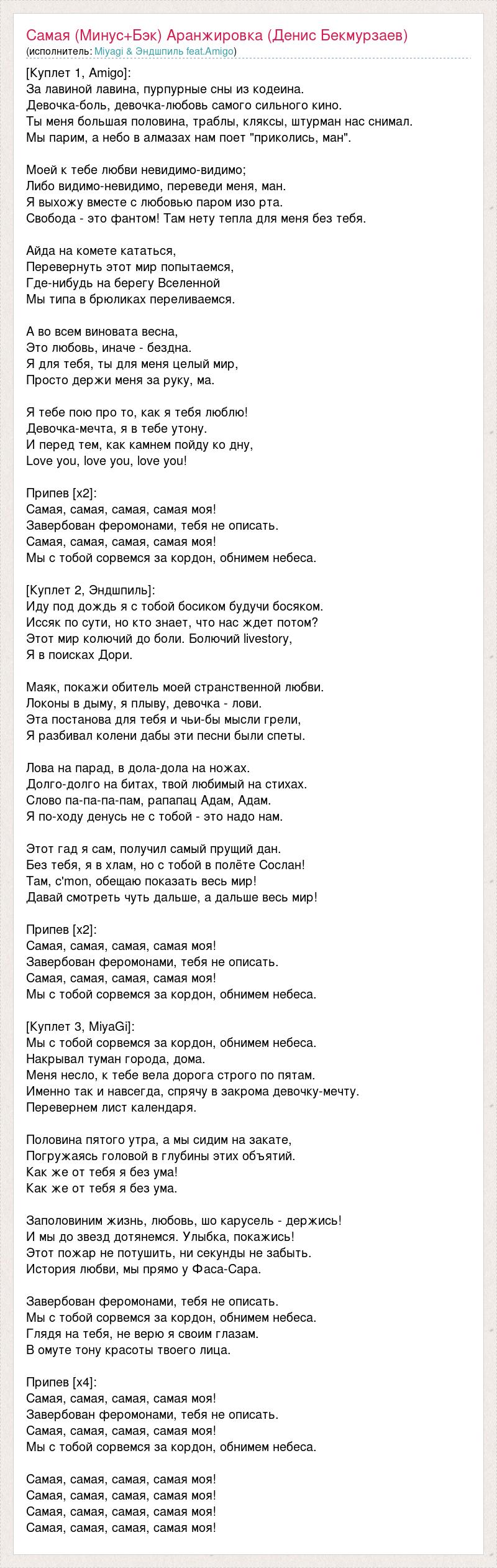 [Куплет 1, Amigo]: За лавиной лавина, пурпурные сны из кодеина. Девочка-боль, девочка-любовь самого сильного кино. Ты меня большая половина, траблы, кляксы, штурман нас снимал. Мы парим, а небо в алмазах нам поет "приколись, ман". Моей к тебе любви невидимо-видимо; Либо видимо-невидимо, переведи меня, ман. Я выхожу вместе с любовью паром изо рта. Свобода - это фантом! Там нету тепла для меня без тебя. Айда на комете кататься, Перевернуть этот мир попытаемся, Где-нибудь на берегу Вселенной Мы типа в брюликах переливаемся. А во всем виновата весна, Это любовь, иначе - бездна. Я для тебя, ты для меня целый мир, Просто держи меня за руку, ма. Я тебе пою про то, как я тебя люблю! Девочка-мечта, я в тебе утону. И перед тем, как камнем пойду ко дну, Love you, love you, love you! Припев [х2]: Самая, самая, самая, самая моя! Завербован феромонами, тебя не описать. Самая, самая, самая, самая моя! Мы с тобой сорвемся за кордон, обнимем небеса. [Куплет 2, Эндшпиль]: Иду под дождь я с тобой босиком будучи босяком. Иссяк по сути, но кто знает, что нас ждет потом? Этот мир колючий до боли. Болючий livestory, Я в поисках Дори. Маяк, покажи обитель моей странственной любви. Локоны в дыму, я плыву, девочка - лови. Эта постанова для тебя и чьи-бы мысли грели, Я разбивал колени дабы эти песни были спеты. Лова на парад, в дола-дола на ножах. Долго-долго на битах, твой любимый на стихах. Слово па-па-па-пам, рапапац Адам, Адам. Я по-ходу денусь не с тобой - это надо нам. Этот гад я сам, получил самый прущий дан. Без тебя, я в хлам, но с тобой в полёте Сослан! Там, c'mon, обещаю показать весь мир! Давай смотреть чуть дальше, а дальше весь мир! Припев [х2]: Самая, самая, самая, самая моя! Завербован феромонами, тебя не описать. Самая, самая, самая, самая моя! Мы с тобой сорвемся за кордон, обнимем небеса. [Куплет 3, MiyaGi]: Мы с тобой сорвемся за кордон, обнимем небеса. Накрывал туман города, дома. Меня несло, к тебе вела дорога строго по пятам. Именно так и навсегда, спрячу в закрома девочку-мечту. Перевернем лист календаря. Половина пятого утра, а мы сидим на закате, Погружаясь головой в глубины этих объятий. Как же от тебя я без ума! Как же от тебя я без ума. Заполовиним жизнь, любовь, шо карусель - держись! И мы до звезд дотянемся. Улыбка, покажись! Этот пожар не потушить, ни секунды не забыть. История любви, мы прямо у Фаса-Сара. Завербован феромонами, тебя не описать. Мы с тобой сорвемся за кордон, обнимем небеса. Глядя на тебя, не верю я своим глазам. В омуте тону красоты твоего лица. Припев [х4]: Самая, самая, самая, самая моя! Завербован феромонами, тебя не описать. Самая, самая, самая, самая моя! Мы с тобой сорвемся за кордон, обнимем небеса. Самая, самая, самая, самая моя! Самая, самая, самая, самая моя! Самая, самая, самая, самая моя! Самая, самая, самая, самая моя!