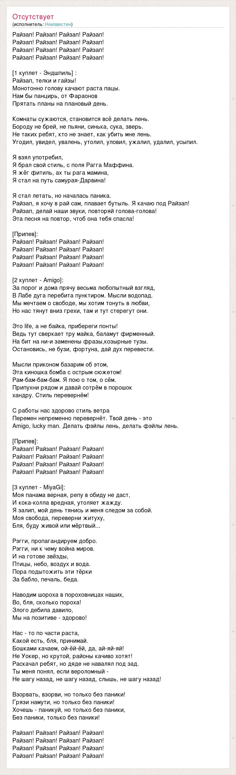 Райзап! Райзап! Райзап! Райзап! Райзап! Райзап! Райзап! Райзап! Райзап! Райзап! Райзап! Райзап! Райзап! Райзап! Райзап! Райзап! [1 куплет - Эндшпиль] : Райзап, телки и гайзы! Монотонно голову качают раста пацы. Нам бы панцирь, от Фараонов Прятать планы на плановый день. Комнаты сужаются, становится всё делать лень. Бороду не брей, не пьяни, синька, сука, зверь. Не таких ребят, кто не знает, как убить мне лень. Угодил, увидел, увалень, утолил, уловил, ужалил, удалил, усыпил. Я взял употребил, Я брал свой стиль, с поля Рагга Маффина. Я жёг фитиль, ах ты рага мамина, Я стал на путь самурая-Дарвина! Я стал летать, но началась паника. Райзап, я хочу в рай сам, плавает бутыль. Я качаю под Райзап! Райзап, делай наши звуки, повторяй голова-голова! Эта песня на повтор, чтоб она тебя спасла! [Припев]: Райзап! Райзап! Райзап! Райзап! Райзап! Райзап! Райзап! Райзап! Райзап! Райзап! Райзап! Райзап! Райзап! Райзап! Райзап! Райзап! [2 куплет - Amigo]: За порог и дома прячу весьма любопытный взгляд, В Лабе дуга перебита пунктиром. Мысли водопад. Мы мечтаем о свободе, мы хотим тонуть в любви, Но нас тянут вниз грехи, там и тут стерегут они. Это life, а не байка, прибереги понты! Ведь тут сверкает тру майка, баламут фирменный. На бит на ни-и заменены фразы,козырные тузы. Остановись, не бузи, фортуна, дай дух перевести. Мысли приконом базарим об этом, Эта киношка бомба с острым сюжетом! Рам-бам-бам-бам. Я пою о том, о сём. Припухни рядом и давай сотрём в порошок хандру. Стиль перевернём! С работы нас здорово стиль ветра Перемен непременно перевернёт. Твой день - это Amigo, lucky man. Делать фэйлы лень, делать фэйлы лень. [Припев]: Райзап! Райзап! Райзап! Райзап! Райзап! Райзап! Райзап! Райзап! Райзап! Райзап! Райзап! Райзап! Райзап! Райзап! Райзап! Райзап! [3 куплет - MiyaGi]: Моя панама верная, репу в обиду не даст, И кока-колла вредная, утоляет жажду. Я залип, мой день тянись и меня следом за собой. Моя свобода, переверни житуху, Бля, буду живой или мёртвый... Рэгги, пропагандируем добро. Рэгги, ни к чему война миров. И на готове звёзды, Птицы, небо, воздух и вода. Пора подытожить эти тёрки За бабло, печаль, беда. Наводим шороха в пороховницах наших, Во, бля, сколько пороха! Злого дебила давило, Мы на позитиве - здорово! Нас - то по части раста, Какой есть, бля, принимай. Бошками качаем, ой-ёй-ёй, да, ай-яй-яй! Не Уокер, но крутой, районы качиво хотят! Раскачал ребят, но дяде не навалял под зад. Ты меня понял, если вероломный - Не шагу назад, не шагу назад, слышь, не шагу назад! Взорвать, взорви, но только без паники! Грязи намути, но только без паники! Хочешь - паникуй, но только без паники, Без паники, только без паники! Райзап! Райзап! Райзап! Райзап! Райзап! Райзап! Райзап! Райзап! Райзап! Райзап! Райзап! Райзап! Райзап! Райзап! Райзап! Райзап!