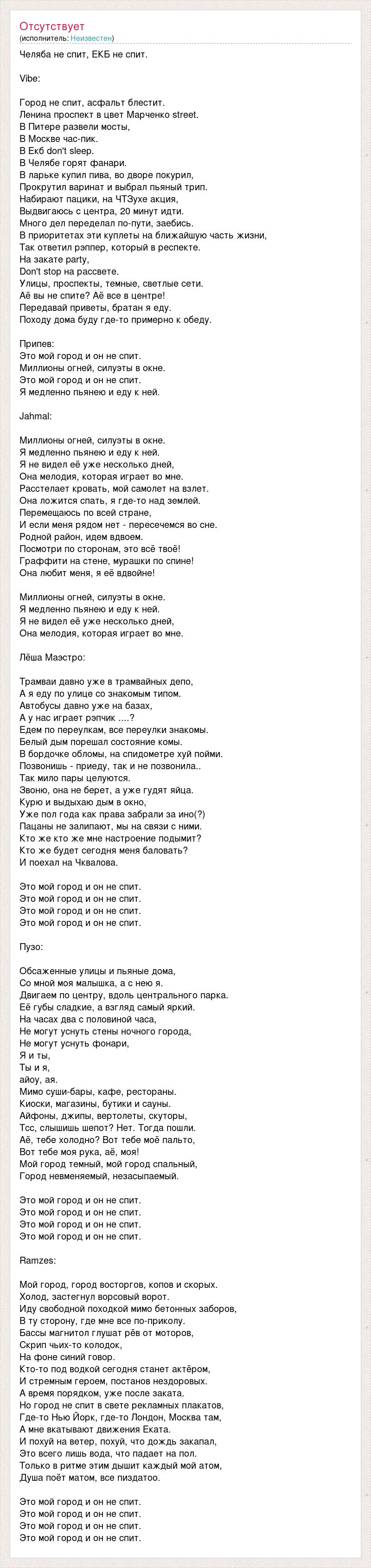 Челяба не спит, ЕКБ не спит. Vibe: Город не спит, асфальт блестит. Ленина проспект в цвет Марченко street. В Питере развели мосты, В Москве час-пик. В Екб don't sleep. В Челябе горят фанари. В ларьке купил пива, во дворе покурил, Прокрутил варинат и выбрал пьяный трип. Набирают пацики, на ЧТЗухе акция, Выдвигаюсь с центра, 20 минут идти. Много дел переделал по-пути, заебись. В приоритетах эти куплеты на ближайшую часть жизни, Так ответил рэппер, который в респекте. На закате party, Don't stop на рассвете. Улицы, проспекты, темные, светлые сети. Аё вы не спите? Аё все в центре! Передавай приветы, братан я еду. Походу дома буду где-то примерно к обеду. Припев: Это мой город и он не спит. Миллионы огней, силуэты в окне. Это мой город и он не спит. Я медленно пьянею и еду к ней. Jahmal: Миллионы огней, силуэты в окне. Я медленно пьянею и еду к ней. Я не видел её уже несколько дней, Она мелодия, которая играет во мне. Расстелает кровать, мой самолет на взлет. Она ложится спать, я где-то над землей. Перемещаюсь по всей стране, И если меня рядом нет - пересечемся во сне. Родной район, идем вдвоем. Посмотри по сторонам, это всё твоё! Граффити на стене, мурашки по спине! Она любит меня, я её вдвойне! Миллионы огней, силуэты в окне. Я медленно пьянею и еду к ней. Я не видел её уже несколько дней, Она мелодия, которая играет во мне. Лёша Маэстро: Трамваи давно уже в трамвайных депо, А я еду по улице со знакомым типом. Автобусы давно уже на базах, А у нас играет рэпчик ....? Едем по переулкам, все переулки знакомы. Белый дым порешал состояние комы. В бордочке обломы, на спидометре хуй пойми. Позвонишь - приеду, так и не позвонила.. Так мило пары целуются. Звоню, она не берет, а уже гудят яйца. Курю и выдыхаю дым в окно, Уже пол года как права забрали за ино(?) Пацаны не залипают, мы на связи с ними. Кто же кто же мне настроение подымит? Кто же будет сегодня меня баловать? И поехал на Чквалова. Это мой город и он не спит. Это мой город и он не спит. Это мой город и он не спит. Это мой город и он не спит. Пузо: Обсаженные улицы и пьяные дома, Со мной моя малышка, а с нею я. Двигаем по центру, вдоль центрального парка. Её губы сладкие, а взгляд самый яркий. На часах два с половиной часа, Не могут уснуть стены ночного города, Не могут уснуть фонари, Я и ты, Ты и я, айоу, ая. Мимо суши-бары, кафе, рестораны. Киоски, магазины, бутики и сауны. Айфоны, джипы, вертолеты, скуторы, Тсс, слышишь шепот? Нет. Тогда пошли. Аё, тебе холодно? Вот тебе моё пальто, Вот тебе моя рука, аё, моя! Мой город темный, мой город спальный, Город невменяемый, незасыпаемый. Это мой город и он не спит. Это мой город и он не спит. Это мой город и он не спит. Это мой город и он не спит. Ramzes: Мой город, город восторгов, копов и скорых. Холод, застегнул ворсовый ворот. Иду свободной походкой мимо бетонных заборов, В ту сторону, где мне все по-приколу. Бассы магнитол глушат рёв от моторов, Скрип чьих-то колодок, На фоне синий говор. Кто-то под водкой сегодня станет актёром, И стремным героем, постанов нездоровых. А время порядком, уже после заката. Но город не спит в свете рекламных плакатов, Где-то Нью Йорк, где-то Лондон, Москва там, А мне вкатывают движения Еката. И похуй на ветер, похуй, что дождь закапал, Это всего лишь вода, что падает на пол. Только в ритме этим дышит каждый мой атом, Душа поёт матом, все пиздатоо. Это мой город и он не спит. Это мой город и он не спит. Это мой город и он не спит. Э