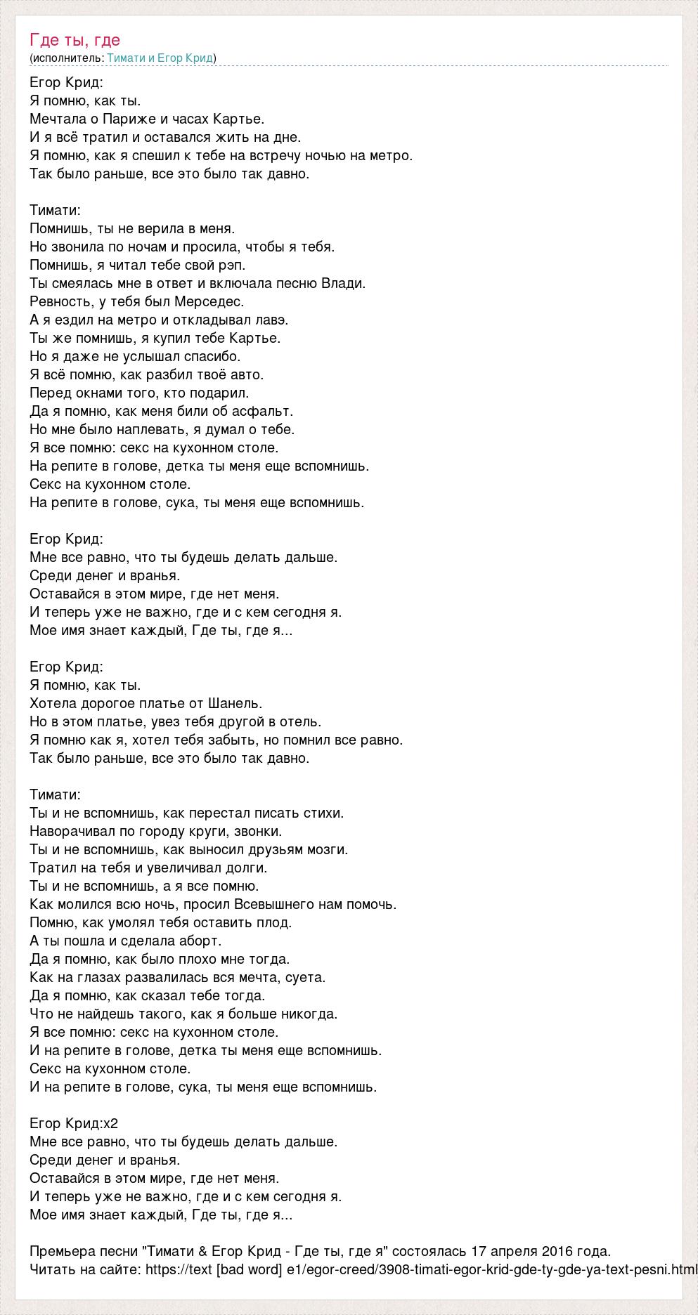 Егор Крид: Я помню, как ты. Мечтала о Париже и часах Картье. И я всё тратил и оставался жить на дне. Я помню, как я спешил к тебе на встречу ночью на метро. Так было раньше, все это было так давно. Тимати: Помнишь, ты не верила в меня. Но звонила по ночам и просила, чтобы я тебя. Помнишь, я читал тебе свой рэп. Ты смеялась мне в ответ и включала песню Влади. Ревность, у тебя был Мерседес. А я ездил на метро и откладывал лавэ. Ты же помнишь, я купил тебе Картье. Но я даже не услышал спасибо. Я всё помню, как разбил твоё авто. Перед окнами того, кто подарил. Да я помню, как меня били об асфальт. Но мне было наплевать, я думал о тебе. Я все помню: секс на кухонном столе. На репите в голове, детка ты меня еще вспомнишь. Секс на кухонном столе. На репите в голове, сука, ты меня еще вспомнишь. Егор Крид: Мне все равно, что ты будешь делать дальше. Среди денег и вранья. Оставайся в этом мире, где нет меня. И теперь уже не важно, где и с кем сегодня я. Мое имя знает каждый, Где ты, где я... Егор Крид: Я помню, как ты. Хотела дорогое платье от Шанель. Но в этом платье, увез тебя другой в отель. Я помню как я, хотел тебя забыть, но помнил все равно. Так было раньше, все это было так давно. Тимати: Ты и не вспомнишь, как перестал писать стихи. Наворачивал по городу круги, звонки. Ты и не вспомнишь, как выносил друзьям мозги. Тратил на тебя и увеличивал долги. Ты и не вспомнишь, а я все помню. Как молился всю ночь, просил Всевышнего нам помочь. Помню, как умолял тебя оставить плод. А ты пошла и сделала аборт. Да я помню, как было плохо мне тогда. Как на глазах развалилась вся мечта, суета. Да я помню, как сказал тебе тогда. Что не найдешь такого, как я больше никогда. Я все помню: секс на кухонном столе. И на репите в голове, детка ты меня еще вспомнишь. Секс на кухонном столе. И на репите в голове, сука, ты меня еще вспомнишь. Егор Крид:х2 Мне все равно, что ты будешь делать дальше. Среди денег и вранья. Оставайся в этом мире, где нет меня. И теперь уже не важно, где и с кем сегодня я. Мое имя знает каждый, Где ты, где я... Премьера песни "Тимати & Егор Крид - Где ты, где я" состоялась 17 апреля 2016 года. Читать на сайте: https://text [bad word] e1/egor-creed/3908-timati-egor-krid-gde-ty-gde-ya-text-pesni.html