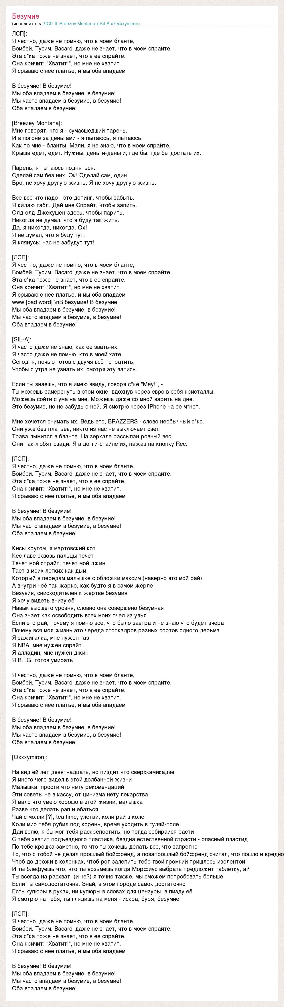 ЛСП]: Я честно, даже не помню, что в моем бланте, Бомбей. Тусим. Bacardi даже не знает, что в моем спрайте. Эта с*ка тоже не знает, что в ее спрайте. Она кричит: "Хватит!", но мне не хватит. Я срываю с нее платье, и мы оба впадаем В безумие! В безумие! Мы оба впадаем в безумие, в безумие! Мы часто впадаем в безумие, в безумие! Оба впадаем в безумие! [Breezey Montana]: Мне говорят, что я - сумасшедший парень. И в погоне за деньгами - я пытаюсь, я пытаюсь. Как по мне - бланты. Мали, я не знаю, что в моем спрайте. Крыша едет, едет. Нужны: деньги-деньги; где бы, где бы достать их. Парень, я пытаюсь подняться. Сделай сам без них. Ок! Сделай сам, один. Бро, не хочу другую жизнь. Я не хочу другую жизнь. Все-все что надо - это допинг, чтобы забыть. Я кидаю табл. Дай мне Спрайт, чтобы запить. Олд-олд Джекушен здесь, чтобы парить. Никогда не думал, что я буду так жить. Да, я никогда, никогда. Ох! Я не думал, что я буду тут. Я клянусь: нас не забудут тут! [ЛСП]: Я честно, даже не помню, что в моем бланте, Бомбей. Тусим. Bacardi даже не знает, что в моем спрайте. Эта с*ка тоже не знает, что в ее спрайте. Она кричит: "Хватит!", но мне не хватит. Я срываю с нее платье, и мы оба впадаем www [bad word] В безумие! В безумие! Мы оба впадаем в безумие, в безумие! Мы часто впадаем в безумие, в безумие! Оба впадаем в безумие! [SIL-A]: Я часто даже не знаю, как ее звать-их. Я часто даже не помню, кто в моей хате. Сегодня, ночью готов с двумя всё потратить, Чтобы с утра не узнать их, смотря эту запись. Если ты знаешь, что я имею ввиду, говоря с*ке "Мяу!", - Ты можешь замерзнуть в этом окне, вдохнув через евро в себя кристаллы. Можешь сойти с ума на мне. Можешь даже со мной варить на дне. Это безумие, но не забудь о ней. Я смотрю через IPhone на ее м*нет. Мне хочется снимать их. Ведь это, BRAZZERS - слово необычный с*кс. Они уже без платьев, никто из нас не выключает свет. Трава дымится в бланте. На зеркале рассыпан ровный вес. Они так любят сзади. Я в догги-стайле их, нажав на кнопку Rec. [ЛСП]: Я честно, даже не помню, что в моем бланте, Бомбей. Тусим. Bacardi даже не знает, что в моем спрайте. Эта с*ка тоже не знает, что в ее спрайте. Она кричит: "Хватит!", но мне не хватит. Я срываю с нее платье, и мы оба впадаем В безумие! В безумие! Мы оба впадаем в безумие, в безумие! Мы часто впадаем в безумие, в безумие! Оба впадаем в безумие! Кисы кругом, я мартовский кот Кес лаве сквозь пальцы течет Течет мой спрайт, течет мой джин Тает в моих легких как дым Который я передам малышке с обложки максим (наверно это мой рай) А внутри неё так жарко, как будто я в самом жерле Везувия, снисходителен к жертве безумия Я хочу видеть внизу её Навык высшего уровня, словно она совершено безумная Она знает как освободить всех моих пчел из улья Если это рай, почему я помню все, что было завтра и не знаю что будет вчера Почему вся моя жизнь это череда стопкадров разных сортов одного дерьма Я зажигалка, мне нужен газ Я NBA, мне нужен спрайт Я алладин, мне нужен джин Я B.I.G, готов умирать Я честно, даже не помню, что в моем бланте, Бомбей. Тусим. Bacardi даже не знает, что в моем спрайте. Эта с*ка тоже не знает, что в ее спрайте. Она кричит: "Хватит!", но мне не хватит. Я срываю с нее платье, и мы оба впадаем В безумие! В безумие! Мы оба впадаем в безумие, в безумие! Мы часто впадаем в безумие, в безумие! Оба впадаем в безумие! [Oxxxymiron]: На вид ей лет девятнадцать, но пиздит что сверхкамикадзе Я много чего видел в этой долбанной жизни Малышка, прости чт