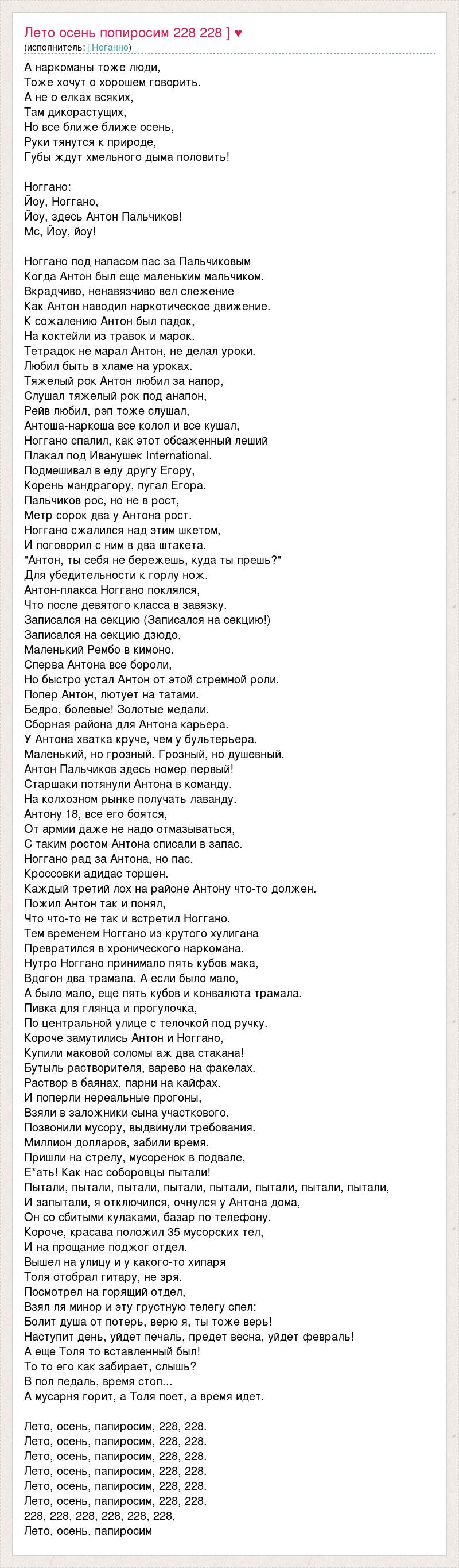 А наркоманы тоже люди, Тоже хочут о хорошем говорить. А не о елках всяких, Там дикорастущих, Но все ближе ближе осень, Руки тянутся к природе, Губы ждут хмельного дыма половить! Ноггано: Йоу, Ноггано, Йоу, здесь Антон Пальчиков! Мс, Йоу, йоу! Ноггано под напасом пас за Пальчиковым Когда Антон был еще маленьким мальчиком. Вкрадчиво, ненавязчиво вел слежение Как Антон наводил наркотическое движение. К сожалению Антон был падок, На коктейли из травок и марок. Тетрадок не марал Антон, не делал уроки. Любил быть в хламе на уроках. Тяжелый рок Антон любил за напор, Слушал тяжелый рок под анапон, Рейв любил, рэп тоже слушал, Антоша-наркоша все колол и все кушал, Ноггано спалил, как этот обсаженный леший Плакал под Иванушек International. Подмешивал в еду другу Егору, Корень мандрагору, пугал Егора. Пальчиков рос, но не в рост, Метр сорок два у Антона рост. Ноггано сжалился над этим шкетом, И поговорил с ним в два штакета. "Антон, ты себя не бережешь, куда ты прешь?" Для убедительности к горлу нож. Антон-плакса Ноггано поклялся, Что после девятого класса в завязку. Записался на секцию (Записался на секцию!) Записался на секцию дзюдо, Маленький Рембо в кимоно. Сперва Антона все бороли, Но быстро устал Антон от этой стремной роли. Попер Антон, лютует на татами. Бедро, болевые! Золотые медали. Сборная района для Антона карьера. У Антона хватка круче, чем у бультерьера. Маленький, но грозный. Грозный, но душевный. Антон Пальчиков здесь номер первый! Старшаки потянули Антона в команду. На колхозном рынке получать лаванду. Антону 18, все его боятся, От армии даже не надо отмазываться, С таким ростом Антона списали в запас. Ноггано рад за Антона, но пас. Кроссовки адидас торшен. Каждый третий лох на районе Антону что-то должен. Пожил Антон так и понял, Что что-то не так и встретил Ноггано. Тем временем Ноггано из крутого хулигана Превратился в хронического наркомана. Нутро Ноггано принимало пять кубов мака, Вдогон два трамала. А если было мало, А было мало, еще пять кубов и конвалюта трамала. Пивка для глянца и прогулочка, По центральной улице с телочкой под ручку. Короче замутились Антон и Ноггано, Купили маковой соломы аж два стакана! Бутыль растворителя, варево на факелах. Раствор в баянах, парни на кайфах. И поперли нереальные прогоны, Взяли в заложники сына участкового. Позвонили мусору, выдвинули требования. Миллион долларов, забили время. Пришли на стрелу, мусоренок в подвале, Е*ать! Как нас соборовцы пытали! Пытали, пытали, пытали, пытали, пытали, пытали, пытали, пытали, И запытали, я отключился, очнулся у Антона дома, Он со сбитыми кулаками, базар по телефону. Короче, красава положил 35 мусорских тел, И на прощание поджог отдел. Вышел на улицу и у какого-то хипаря Толя отобрал гитару, не зря. Посмотрел на горящий отдел, Взял ля минор и эту грустную телегу спел: Болит душа от потерь, верю я, ты тоже верь! Наступит день, уйдет печаль, предет весна, уйдет февраль! А еще Толя то вставленный был! То то его как забирает, слышь? В пол педаль, время стоп... А мусарня горит, а Толя поет, а время идет. Лето, осень, папиросим, 228, 228. Лето, осень, папиросим, 228, 228. Лето, осень, папиросим, 228, 228. Лето, осень, папиросим, 228, 228. Лето, осень, папиросим, 228, 228. Лето, осень, папиросим, 228, 228. 228, 228, 228, 228, 228, 228, Лето, осень, папиросим