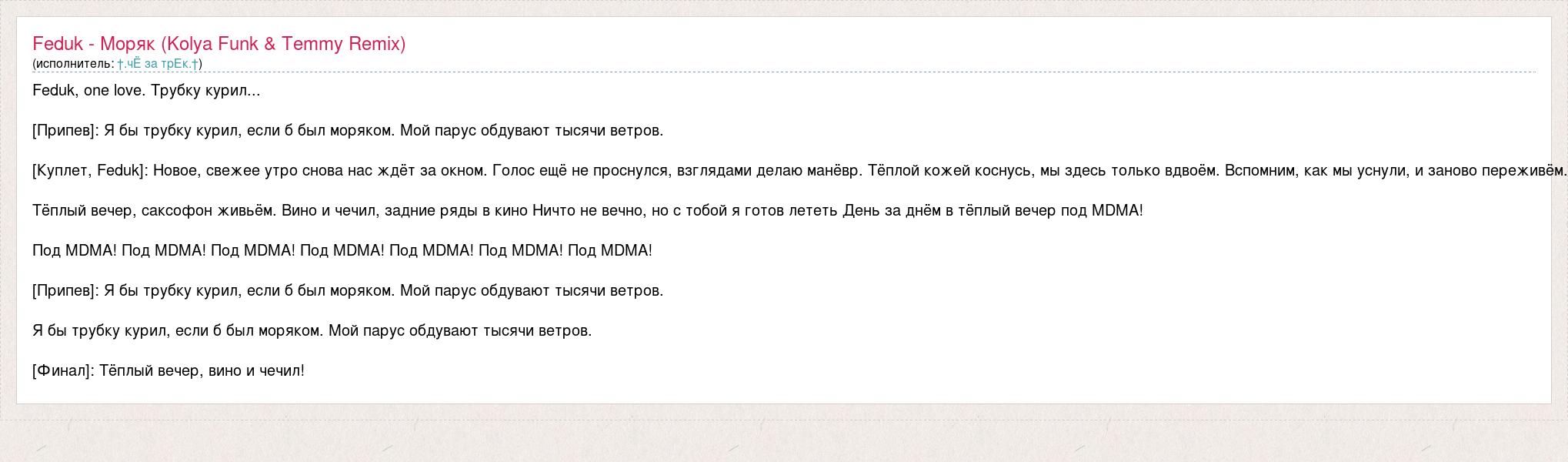 Feduk, one love. Трубку курил... [Припев]: Я бы трубку курил, если б был моряком. Мой парус обдувают тысячи ветров. [Куплет, Feduk]: Новое, свежее утро снова нас ждёт за окном. Голос ещё не проснулся, взглядами делаю манёвр. Тёплой кожей коснусь, мы здесь только вдвоём. Вспомним, как мы уснули, и заново переживём. Тёплый вечер, саксофон живьём. Вино и чечил, задние ряды в кино Ничто не вечно, но с тобой я готов лететь День за днём в тёплый вечер под MDMA! Под MDMA! Под MDMA! Под MDMA! Под MDMA! Под MDMA! Под MDMA! Под MDMA! [Припев]: Я бы трубку курил, если б был моряком. Мой парус обдувают тысячи ветров. Я бы трубку курил, если б был моряком. Мой парус обдувают тысячи ветров. [Финал]: Тёплый вечер, вино и чечил!
