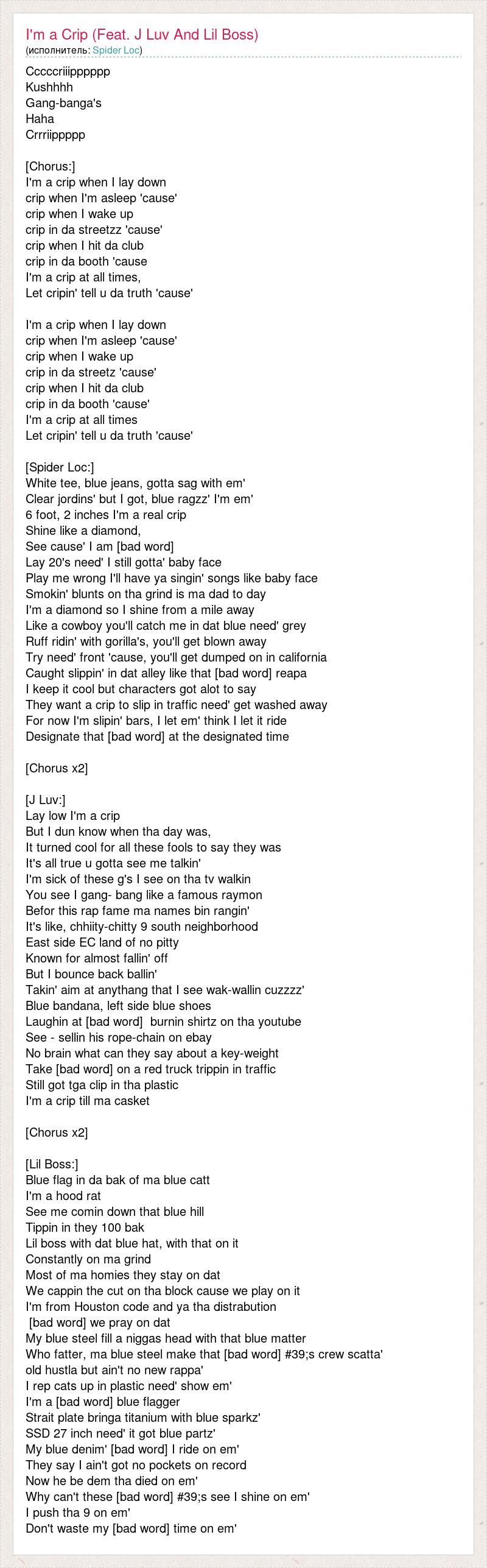 Cccccriiipppppp Kushhhh Gang-banga's Haha Crrriippppp [Chorus:] I'm a crip when I lay down crip when I'm asleep 'cause' crip when I wake up crip in da streetzz 'cause' crip when I hit da club crip in da booth 'cause I'm a crip at all times, Let cripin' tell u da truth 'cause' I'm a crip when I lay down crip when I'm asleep 'cause' crip when I wake up crip in da streetz 'cause' crip when I hit da club crip in da booth 'cause' I'm a crip at all times Let cripin' tell u da truth 'cause' [Spider Loc:] White tee, blue jeans, gotta sag with em' Clear jordins' but I got, blue ragzz' I'm em' 6 foot, 2 inches I'm a real crip Shine like a diamond, See cause' I am [bad word] Lay 20's need' I still gotta' baby face Play me wrong I'll have ya singin' songs like baby face Smokin' blunts on tha grind is ma dad to day I'm a diamond so I shine from a mile away Like a cowboy you'll catch me in dat blue need' grey Ruff ridin' with gorilla's, you'll get blown away Try need' front 'cause, you'll get dumped on in california Caught slippin' in dat alley like that [bad word] reapa I keep it cool but characters got alot to say They want a crip to slip in traffic need' get washed away For now I'm slipin' bars, I let em' think I let it ride Designate that [bad word] at the designated time [Chorus x2] [J Luv:] Lay low I'm a crip But I dun know when tha day was, It turned cool for all these fools to say they was It's all true u gotta see me talkin' I'm sick of these g's I see on tha tv walkin You see I gang- bang like a famous raymon Befor this rap fame ma names bin rangin' It's like, chhiity-chitty 9 south neighborhood East side EC land of no pitty Known for almost fallin' off But I bounce back ballin' Takin' aim at anythang that I see wak-wallin cuzzzz' Blue bandana, left side blue shoes Laughin at [bad word] burnin shirtz on tha youtube See - sellin his rope-chain on ebay No brain what can they say about a key-weight Take [bad word] on a red truck trippin in traffic Still got tga clip in tha plastic I'm a crip till ma casket [Chorus x2] [Lil Boss:] Blue flag in da bak of ma blue catt I'm a hood rat See me comin down that blue hill Tippin in they 100 bak Lil boss with dat blue hat, with that on it Constantly on ma grind Most of ma homies they stay on dat We cappin the cut on tha block cause we play on it I'm from Houston code and ya tha distrabution [bad word] we pray on dat My blue steel fill a niggas head with that blue matter Who fatter, ma blue steel make that [bad word] #39;s crew scatta' old hustla but ain't no new rappa' I rep cats up in plastic need' show em' I'm a [bad word] blue flagger Strait plate bringa titanium with blue sparkz' SSD 27 inch need' it got blue partz' My blue denim' [bad word] I ride on em' They say I ain't got no pockets on record Now he be dem tha died on em' Why can't these [bad word] #39;s see I shine on em' I push tha 9 on em' Don't waste my [bad word] time on em'