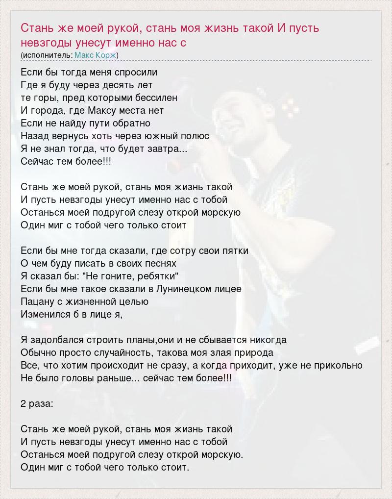 Если бы тогда меня спросили Где я буду через десять лет те горы, пред которыми бессилен И города, где Максу места нет Если не найду пути обратно Назад вернусь хоть через южный полюс Я не знал тогда, что будет завтра... Сейчас тем более!!! Стань же моей рукой, стань моя жизнь такой И пусть невзгоды унесут именно нас с тобой Останься моей подругой слезу открой морскую Один миг с тобой чего только стоит Если бы мне тогда сказали, где сотру свои пятки О чем буду писать в своих песнях Я сказал бы: "Не гоните, ребятки" Если бы мне такое сказали в Лунинецком лицее Пацану с жизненной целью Изменился б в лице я, Я задолбался строить планы,они и не сбывается никогда Обычно просто случайность, такова моя злая природа Все, что хотим происходит не сразу, а когда приходит, уже не прикольно Не было головы раньше... сейчас тем более!!! 2 раза: Стань же моей рукой, стань моя жизнь такой И пусть невзгоды унесут именно нас с тобой Останься моей подругой слезу открой морскую. Один миг с тобой чего только стоит.
