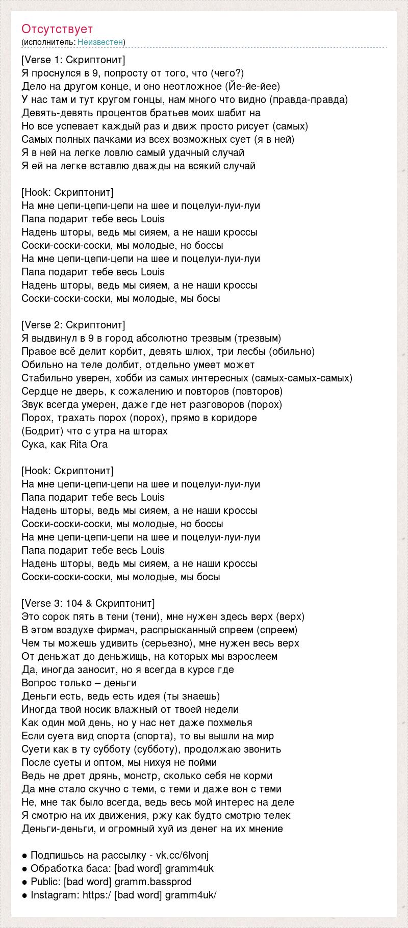 [Verse 1: Скриптонит] Я проснулся в 9, попросту от того, что (чего?) Дело на другом конце, и оно неотложное (Йе-йе-йее) У нас там и тут кругом гонцы, нам много что видно (правда-правда) Девять-девять процентов братьев моих шабит на Но все успевает каждый раз и движ просто рисует (самых) Самых полных пачками из всех возможных сует (я в ней) Я в ней на легке ловлю самый удачный случай Я ей на легке вставлю дважды на всякий случай [Hook: Скриптонит] На мне цепи-цепи-цепи на шее и поцелуи-луи-луи Папа подарит тебе весь Louis Надень шторы, ведь мы сияем, а не наши кроссы Соски-соски-соски, мы молодые, но боссы На мне цепи-цепи-цепи на шее и поцелуи-луи-луи Папа подарит тебе весь Louis Надень шторы, ведь мы сияем, а не наши кроссы Соски-соски-соски, мы молодые, мы босы [Verse 2: Скриптонит] Я выдвинул в 9 в город абсолютно трезвым (трезвым) Правое всё делит корбит, девять шлюх, три лесбы (обильно) Обильно на теле долбит, отдельно умеет может Стабильно уверен, хобби из самых интересных (самых-самых-самых) Сердце не дверь, к сожалению и повторов (повторов) Звук всегда умерен, даже где нет разговоров (порох) Порох, трахать порох (порох), прямо в коридоре (Бодрит) что с утра на шторах Сука, как Rita Ora [Hook: Скриптонит] На мне цепи-цепи-цепи на шее и поцелуи-луи-луи Папа подарит тебе весь Louis Надень шторы, ведь мы сияем, а не наши кроссы Соски-соски-соски, мы молодые, но боссы На мне цепи-цепи-цепи на шее и поцелуи-луи-луи Папа подарит тебе весь Louis Надень шторы, ведь мы сияем, а не наши кроссы Соски-соски-соски, мы молодые, мы босы [Verse 3: 104 & Скриптонит] Это сорок пять в тени (тени), мне нужен здесь верх (верх) В этом воздухе фирмач, распрысканный спреем (спреем) Чем ты можешь удивить (серьезно), мне нужен весь верх От деньжат до деньжищь, на которых мы взрослеем Да, иногда заносит, но я всегда в курсе где Вопрос только – деньги Деньги есть, ведь есть идея (ты знаешь) Иногда твой носик влажный от твоей недели Как один мой день, но у нас нет даже похмелья Если суета вид спорта (спорта), то вы вышли на мир Суети как в ту субботу (субботу), продолжаю звонить После суеты и оптом, мы нихуя не пойми Ведь не дрет дрянь, монстр, сколько себя не корми Да мне стало скучно с теми, с теми и даже вон с теми Не, мне так было всегда, ведь весь мой интерес на деле Я смотрю на их движения, ржу как будто смотрю телек Деньги-деньги, и огромный хуй из денег на их мнение ● Подпишьсь на рассылку - vk.cc/6lvonj ● Обработка баса: [bad word] gramm4uk ● Public: [bad word] gramm.bassprod ● Instagram: https:/ [bad word] gramm4uk/