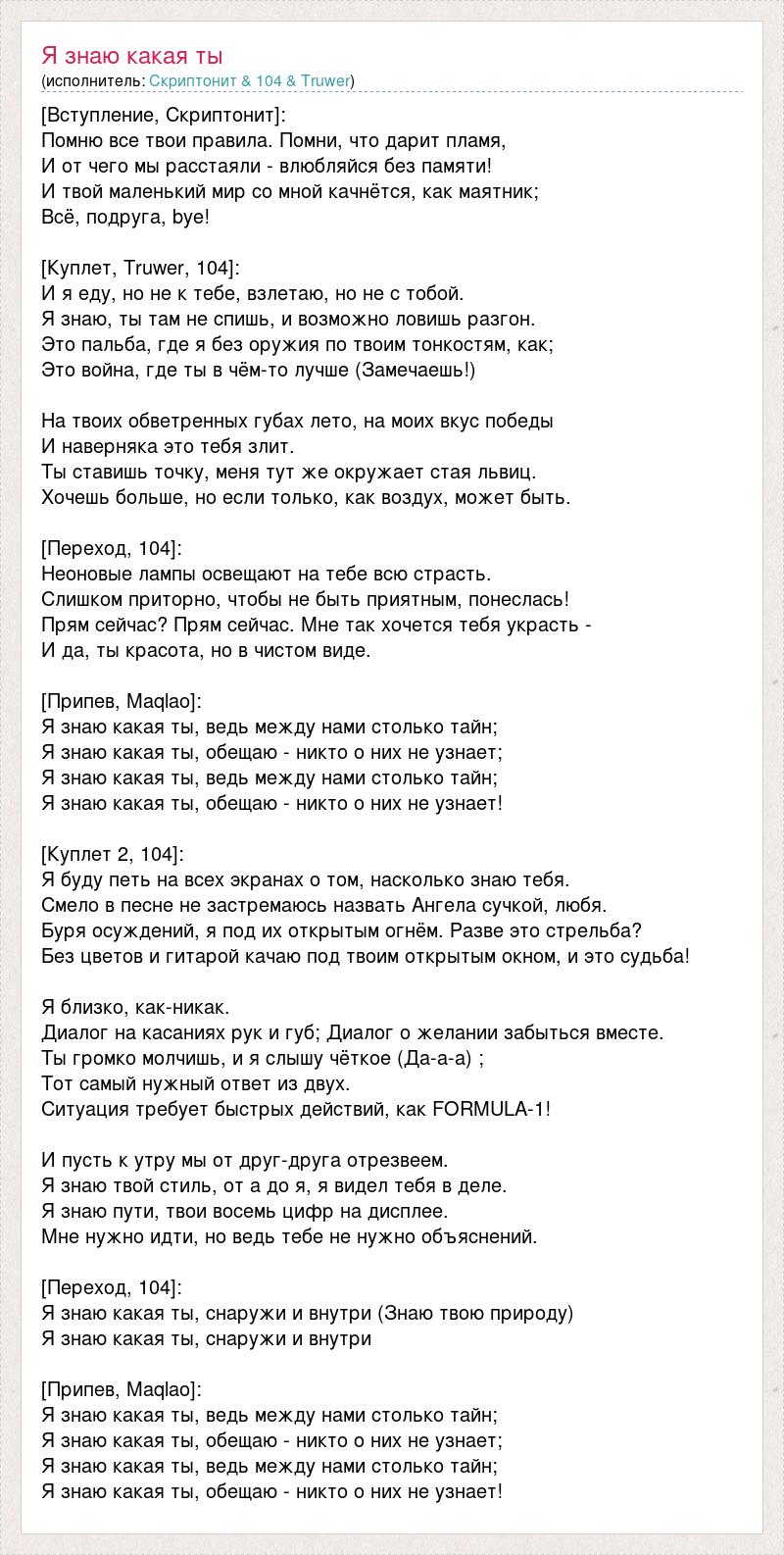 [Вступление, Скриптонит]: Помню все твои правила. Помни, что дарит пламя, И от чего мы расстаяли - влюбляйся без памяти! И твой маленький мир со мной качнётся, как маятник; Всё, подруга, bye! [Куплет, Truwer, 104]: И я еду, но не к тебе, взлетаю, но не с тобой. Я знаю, ты там не спишь, и возможно ловишь разгон. Это пальба, где я без оружия по твоим тонкостям, как; Это война, где ты в чём-то лучше (Замечаешь!) На твоих обветренных губах лето, на моих вкус победы И наверняка это тебя злит. Ты ставишь точку, меня тут же окружает стая львиц. Хочешь больше, но если только, как воздух, может быть. [Переход, 104]: Неоновые лампы освещают на тебе всю страсть. Слишком приторно, чтобы не быть приятным, понеслась! Прям сейчас? Прям сейчас. Мне так хочется тебя украсть - И да, ты красота, но в чистом виде. [Припев, Maqlao]: Я знаю какая ты, ведь между нами столько тайн; Я знаю какая ты, обещаю - никто о них не узнает; Я знаю какая ты, ведь между нами столько тайн; Я знаю какая ты, обещаю - никто о них не узнает! [Куплет 2, 104]: Я буду петь на всех экранах о том, насколько знаю тебя. Смело в песне не застремаюсь назвать Ангела сучкой, любя. Буря осуждений, я под их открытым огнём. Разве это стрельба? Без цветов и гитарой качаю под твоим открытым окном, и это судьба! Я близко, как-никак. Диалог на касаниях рук и губ; Диалог о желании забыться вместе. Ты громко молчишь, и я слышу чёткое (Да-а-а) ; Тот самый нужный ответ из двух. Ситуация требует быстрых действий, как FORMULA-1! И пусть к утру мы от друг-друга отрезвеем. Я знаю твой стиль, от а до я, я видел тебя в деле. Я знаю пути, твои восемь цифр на дисплее. Мне нужно идти, но ведь тебе не нужно объяснений. [Переход, 104]: Я знаю какая ты, снаружи и внутри (Знаю твою природу) Я знаю какая ты, снаружи и внутри [Припев, Maqlao]: Я знаю какая ты, ведь между нами столько тайн; Я знаю какая ты, обещаю - никто о них не узнает; Я знаю какая ты, ведь между нами столько тайн; Я знаю какая ты, обещаю - никто о них не узнает!