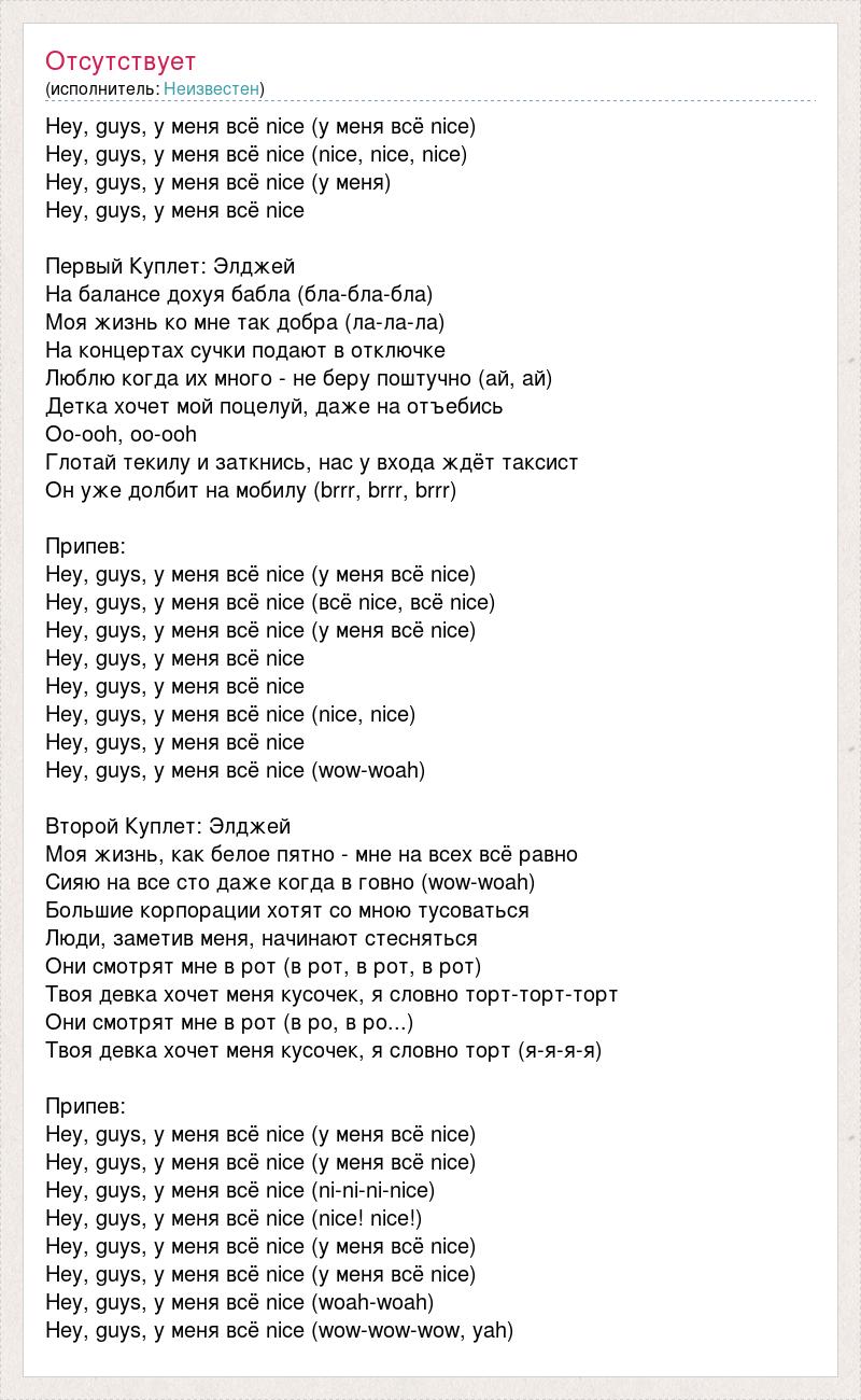 Hey, guys, у меня всё nice (у меня всё nice) Hey, guys, у меня всё nice (nice, nice, nice) Hey, guys, у меня всё nice (у меня) Hey, guys, у меня всё nice Первый Куплет: Элджей На балансе дохуя бабла (бла-бла-бла) Моя жизнь ко мне так добра (ла-ла-ла) На концертах сучки подают в отключке Люблю когда их много - не беру поштучно (ай, ай) Детка хочет мой поцелуй, даже на отъебись Oo-ooh, oo-ooh Глотай текилу и заткнись, нас у входа ждёт таксист Он уже долбит на мобилу (brrr, brrr, brrr) Припев: Hey, guys, у меня всё nice (у меня всё nice) Hey, guys, у меня всё nice (всё nice, всё nice) Hey, guys, у меня всё nice (у меня всё nice) Hey, guys, у меня всё nice Hey, guys, у меня всё nice Hey, guys, у меня всё nice (nice, nice) Hey, guys, у меня всё nice Hey, guys, у меня всё nice (wow-woah) Второй Куплет: Элджей Моя жизнь, как белое пятно - мне на всех всё равно Сияю на все сто даже когда в говно (wow-woah) Большие корпорации хотят со мною тусоваться Люди, заметив меня, начинают стесняться Они смотрят мне в рот (в рот, в рот, в рот) Твоя девка хочет меня кусочек, я словно торт-торт-торт Они смотрят мне в рот (в ро, в ро...) Твоя девка хочет меня кусочек, я словно торт (я-я-я-я) Припев: Hey, guys, у меня всё nice (у меня всё nice) Hey, guys, у меня всё nice (у меня всё nice) Hey, guys, у меня всё nice (ni-ni-ni-nice) Hey, guys, у меня всё nice (nice! nice!) Hey, guys, у меня всё nice (у меня всё nice) Hey, guys, у меня всё nice (у меня всё nice) Hey, guys, у меня всё nice (woah-woah) Hey, guys, у меня всё nice (wow-wow-wow, yah)